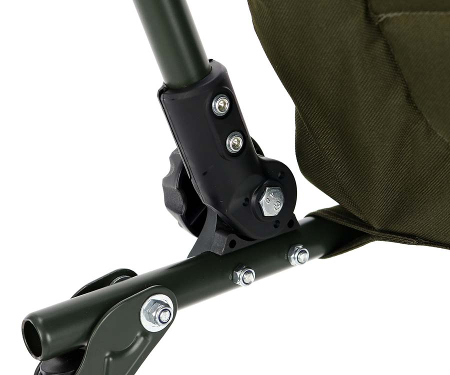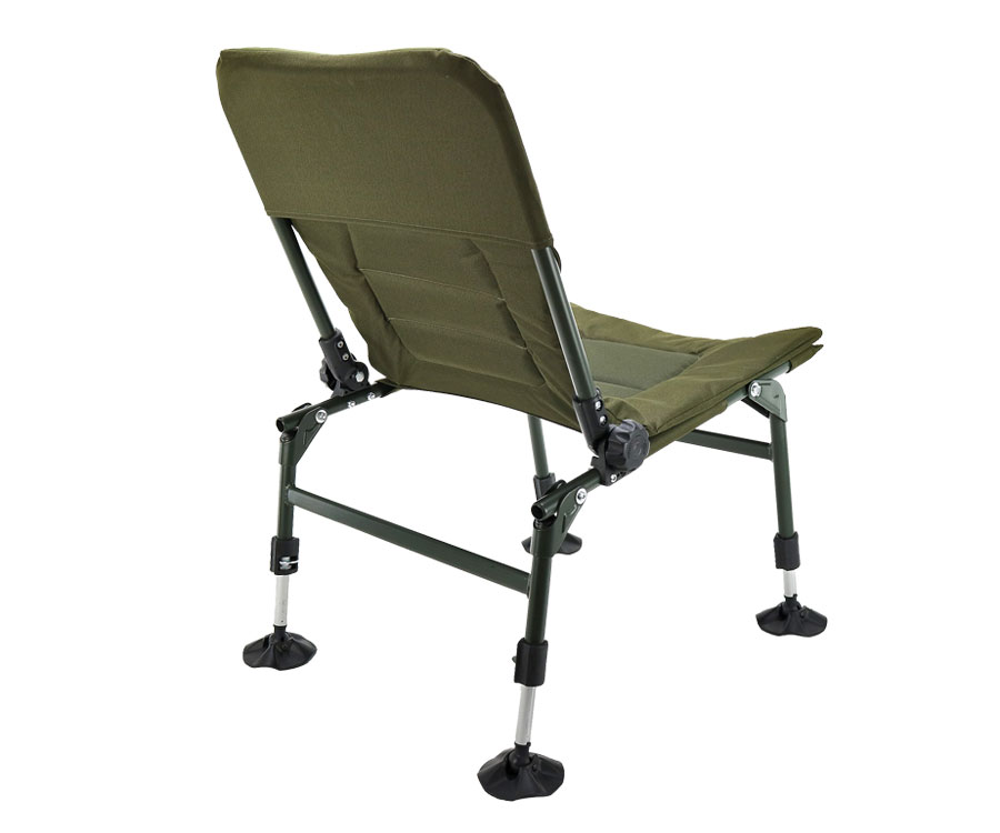Carp Pro Flat Feeder – складане крісло без підлокітників, що спеціально розроблено для флет-фідерної ловлі і яке гарантує риболову високий рівень комфорту. Через відсутність підлокітників маємо вільний доступ до вудлища й навісного устаткування. Використання посиленої сталевої рами дає змогу кріслу Carp Pro Flat Feeder з легкістю витримувати навантаження до 120 кг. Завдяки інтегрованому в спинку підголовнику та м'яким вставкам на сидінні і спинці тіло приймає природне положення. Це сприяє довготривалій ловлі, що не втомлює. Крісло швидко встановити, а кут нахилу спинки легко і просто регулювати в широких межах. Його можна без проблем розмістити на нерівній і похилій поверхні, наприклад, на бетонній дамбі, завдяки чотирьом телескопічним ногам із надійними фіксаторами. Ноги оснащено збільшеними шарнірними п'ятами, які не дають кріслу провалюватися в м'який ґрунт. У транспортному положенні крісло Carp Pro Flat Feeder має компактні розміри, що зручно під час перевезення.