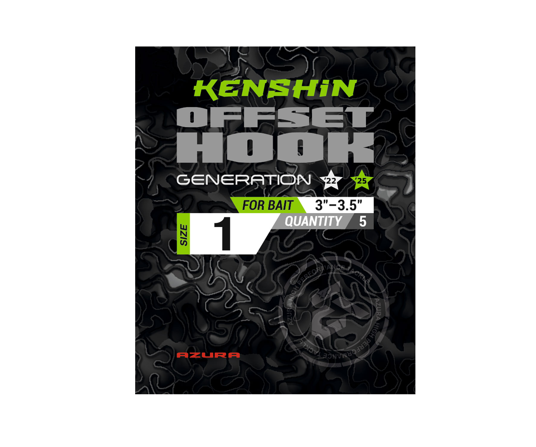 Azura Kenshin ll Offset Hook – серія високоякісних офсетних гачків, розроблених для використання, перш за все, у шарнірних монтажах. Головною відмінністю цих гачків є кільце збільшеного діаметра, завдяки якому забезпечується повна свобода рухів приманки під час проведення. Такий розмір кільця дає змогу використовувати не тільки «вухаті» грузила зі знімними рамами, але і звичайні завідні кільця – для з'єднання гачка з грузилом. Гачки Azura Kenshin ll Offset Hook виготовлені з високовуглецевого сталевого дроту та характеризуються стандартної довжини цівкою, широким вигином класичної форми, кованим піддівом, надгострим жалом із заточуванням Needle Point, акуратною чіпкою борідкою та високоякісним антикорозійним покриттям PTFE, що значно покращує проникаючі властивості гачка. Офсетні гачки Azura Kenshin ll ідеально підходять для оснащення переважної більшості м'яких пластикових приманок різних форм. Широкий розмірний ряд Kenshin ll Offset Hook дає змогу підібрати оптимальний за розміром гачок практично під будь-яку м'яку приманку з розмірами від 1 до 5 дюймів.