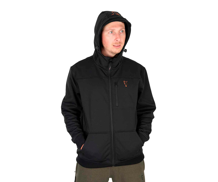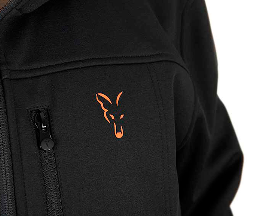 Fox Collection Soft Shell Jacket Black & Orange – чорна курточка з капюшоном і помаранчевим логотипом Fox Head, яку виготовлено в стилі Soft Shell. Куртка Fox Soft Shell Jacket Black & Orange має дві передні та одну нагрудну кишеню на блискавці, еластичні манжети та пояс, регульований капюшон, підкладку з мікрофлісу. Матеріал: 100% поліестер. Fox Soft Shell Jacket B/O наявна в розмірах S-3XL.