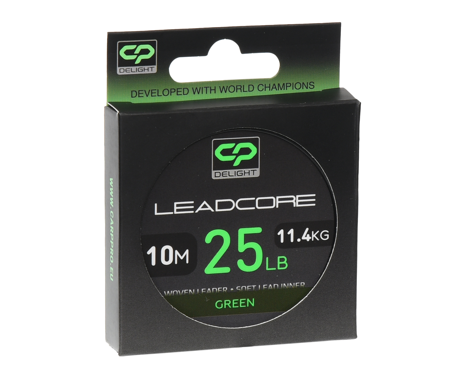 Carp Pro Deligth Leadcore Green – міцний швидкотонучий ледкор із важкою серцевиною з м'якого свинцю. Притискає оснастку до дна та відіграє роль протизакручувача під час закидання. Болотно-зелене забарвлення ледкора Carp Pro Deligth Leadcore Green ідеально маскує його на тлі мулистого або рослинного дна. До того ж м'який плетений матеріал CP Deligth Leadcore Green запобігає травмуванню риби під час виважування, має підвищену стійкість до абразивного впливу, чудову еластичність і легко в'яжеться. Залежно від моделі розривне навантаження становить 25 і 45 Lb. Постачається в розмотуванні 10 м.