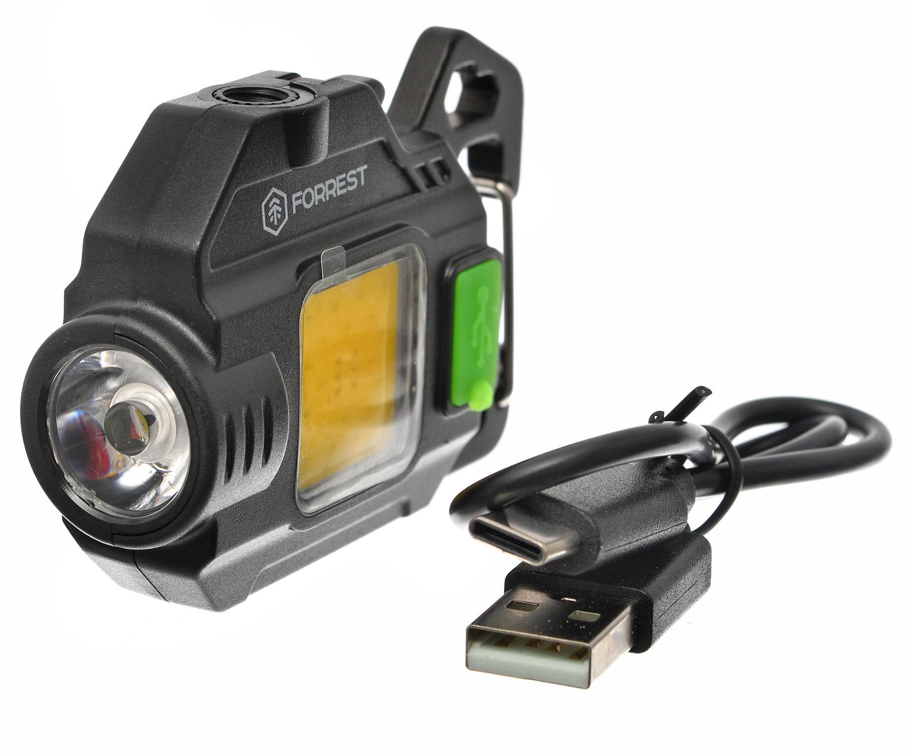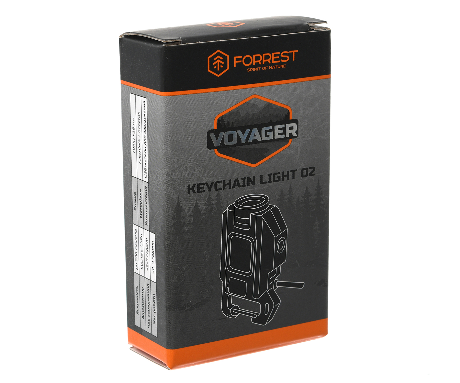 Багатофункціональний ліхтарик-брелок Forrest Voyager Keychain Light 02 – компактний акумуляторний ліхтарик-брелок із потужним світлом, магнітною основою та карабіном. Він стане в нагоді на риболовлі, полюванні, у кемпінгу, туризмі та побуті. Кишеньковий ліхтарик Forrest Voyager Keychain Light 02 обладнаний світлодіодами 5W LED + 6W COB + 0,5W Red COB і має кілька режимів роботи: LED, білий COB, червоний COB. Ліхтарик можна прикріпити до металевих поверхонь або закріпити як брелок на одязі чи спорядженні за допомогою карабіна. Він має яскравість до 500 люменів, міцний корпус, живлення від вбудованого акумулятора 500 мАг, зарядку батареї (3-4 години) через порт Type-C. У комплект поставки входить кабель для зарядки.