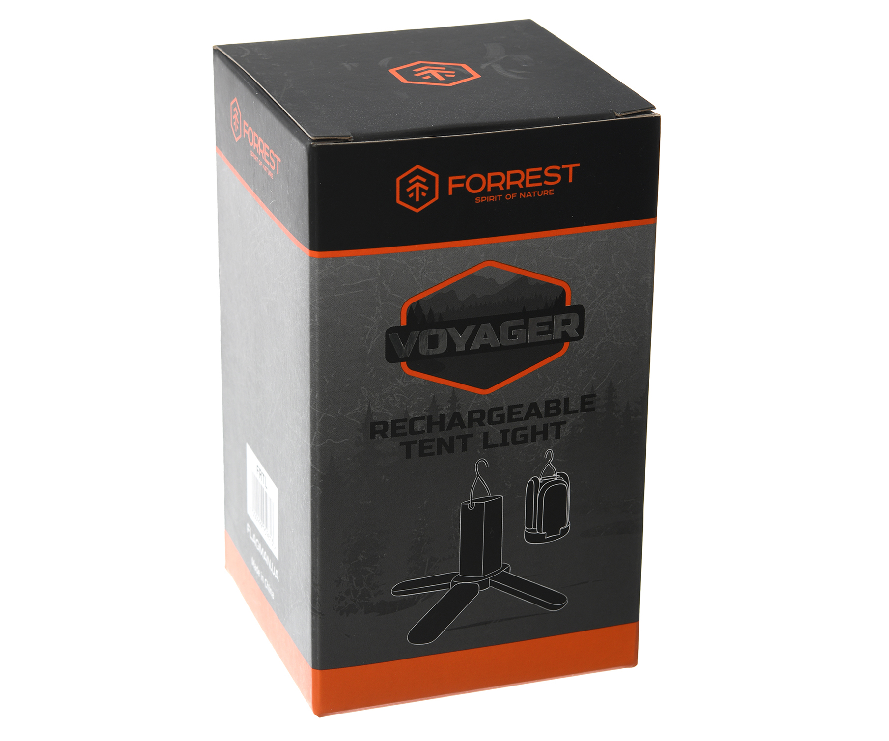 Forrest Rechargeable Tent Light – потужне джерело світла, акумуляторний кемпінговий ліхтар для намету, кемпінгу, дачі або вечірніх пригод на природі. Легкий і компактний кемпінговий ліхтар Forrest Rechargeable Tent Light оснащено складаними лопатями з LED-світлодіодами яскравістю 350 люменів для створення широкої зони освітлення. У якості джерела живлення у виробі застосовується вбудований літієвий акумулятор 2400 мАг, який забезпечує безперервну роботу пристрою впродовж 4-5 годин. Кемпінговий ліхтар Forrest Rechargeable Tent Light має міцний корпус, зручний гачок для підвішування в наметі, зарядку батареї (3-4 години) через порт Type-C. У комплект поставки входить кабель зарядки.