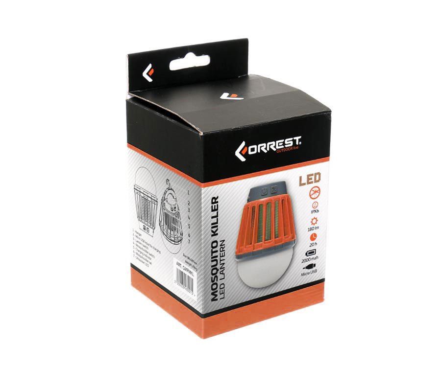 Forrest Mosqito Killer Lamp – компактний світлодіодний ліхтар, який оснащено пасткою для комарів, мошок та інших комах. Така лампа стане чудовим помічником як у побуті, так і на кемпінгу, риболовлі чи полюванні. Як джерело світла в ліхтарі використовується світлодіод потужністю 3 Вт у трьох режимах світіння: максимальної яскравості 180 lm (100%), середньої 90 lm (50%) і мінімальної 30 lm (20%). Ліхтар оснащено акумулятором ємністю 2000 мАг, що забезпечує безперервне світіння від 4 до 20 годин в залежності від обраної яскравості. Зарядка – від будь-якого USB зарядного пристрою через порт micro-USB, кабель в комплекті. Forrest Mosqito Killer Lamp має антимоскітний елемент – УФ-світлодіоди і високовольтну сітку. Висока напруга малого струму абсолютно безпечна для людини, але смертельна для комах. Блакитне світіння приваблює комарів і, потрапляючи на високовольтну сітку, комахи гинуть. Ліхтар має ступінь захисту IPX6 – захист від водяних потоків або сильних струменів із будь-якого напрямку. Тому лампу без проблем можна промивати від налиплих комах. Для додаткового захисту LED-світильника служить м'який гумовий ковпак-розсіювач. Forrest Mosqito Killer Lamp можна поставити на стіл, а також підвісити за гачок або петлю. Розміри – 88×129 мм. Вага – 204 г.