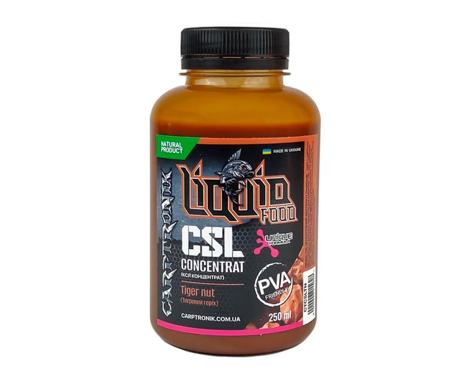 Ліквід Carptronik CSL concentrat – густа рідина (продукт переробки зерна кукурудзи), яка чудово приваблює коропа та амура через високий вміст органічних кислот і цукрів. Містить великий набір амінокислот та інших важливих для харчування коропа компонентів. Це чистий, концентрований, не розбавлений C.S.L. Concentrat від найкращого виробника з Європи. CSL concentrat Carptronik – повністю натуральний продукт. Не має верхньої межі за дозуванням. Його призначено для використання з бойлами, пелетсом, зерновими, стік- і спод-міксами. Наявний із різними ароматами у фасуванні 0.25, 0.5 і 3.0 літра.