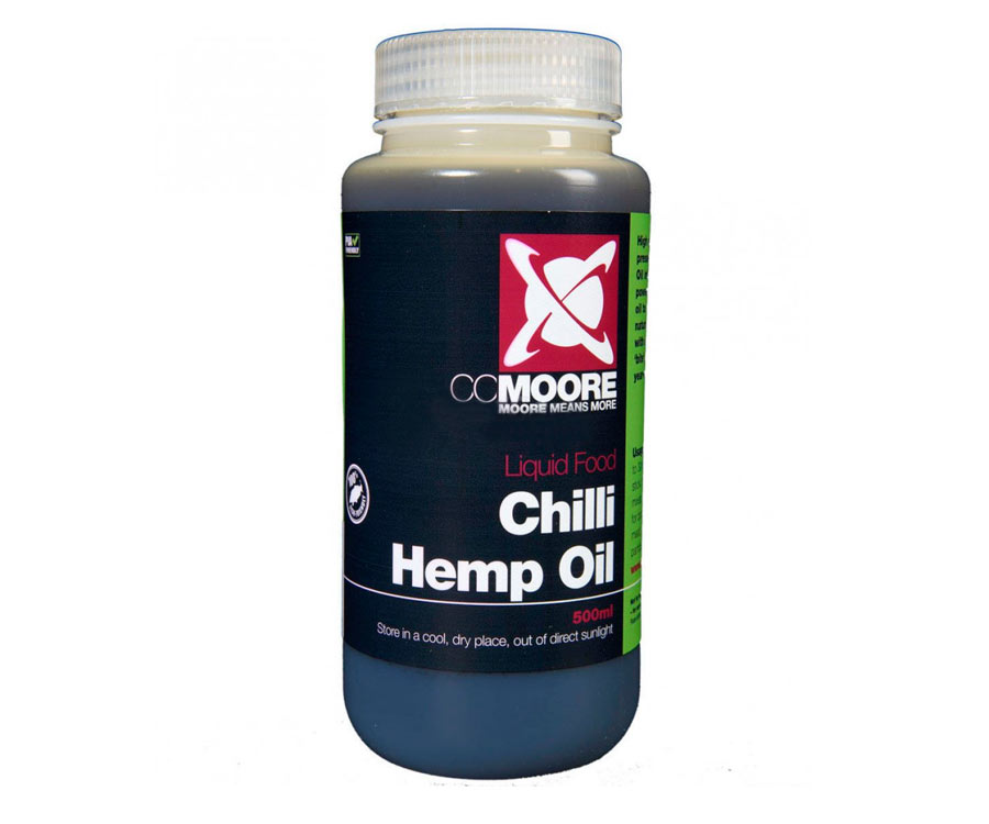 Компанії CC Moore вдалося створити чудовий ліквід - Liquid Chilli Hemp Oil. У його склад входить перець чилі і коноплі. Останній продукт досить часто використовується в рибальських принадах. Висококонцентрована конопляна олія (Hemp Oil) є сильним аттрактантом, який випускає потужні хімічні сигнали в воду. А також є джерелом поживних елементів, таких як гамма-лінолева кислота (GLA), масла OMEGA 3, 6 9, амінокислоти, мікроелементи і група вітамінів С, D, E. Крім того, в ліквіді присутні концентрати бета-каротину і капсаїцину.У поєднанні з чилійським перцем Liquid Chilli Hemp Oil стає неймовірно потужною і безвідмовною «зброєю» для коропової ловлі! Причому ліквід «працює» цілий рік, навіть у холодній воді. Chilli Hemp Oil демонструє прекрасні результати з бойлами в співвідношенні 15-30 мл / кг. Також він і чудова добавка до сумішей для ПВА-пакетів, стіків, сподів, пелетса або «рассипуху». Просто додайте 20-30 мл на кілограм суміші, щоб надати пікантний смак підгодовування, і риба потягнеться до місця ловлі.Нарешті, Chilli Hemp Oil незамінний при ловлі великого вусаня. Додайте Chilli Hemp Oil в контейнер з бойлами, пелетса або до м'ясної насадки. Перед використанням дайте ліквіду вбратися протягом 12-18 годин.