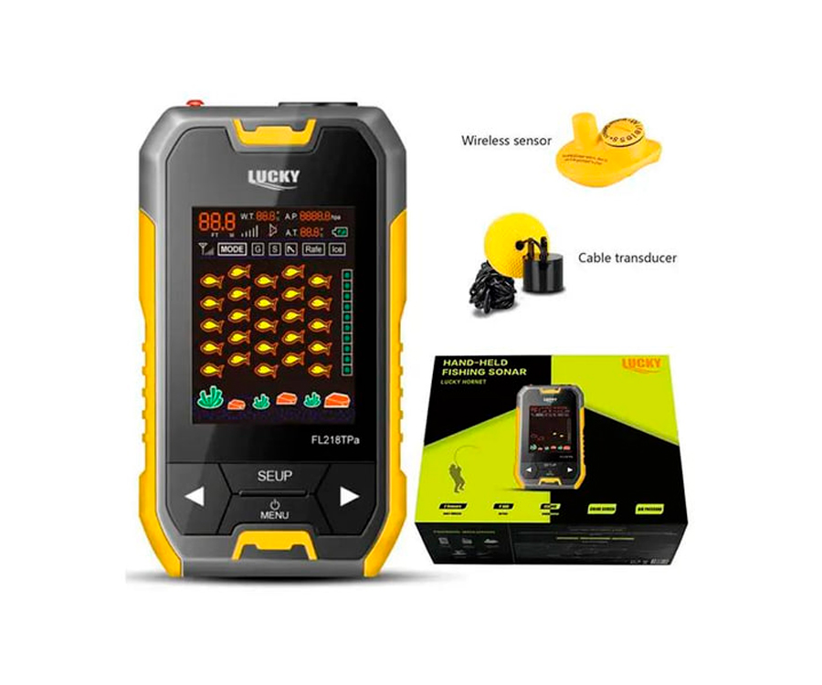 Ехолот Lucky Hornet - поєднує в собі два датчики, бездротовий і дротовий. Підійде як для любителів, так і для професіоналів. Використовуйте ехолот у будь-яку пору року, незважаючи на погодні умови. Ця бюджетна модель бездротового ехолота Lucky має унікальну особливість - це наявність вбудованого барометра. Тепер не потрібно з собою на риболовлю брати окремий пристрій - барометр. Ця модель комплектується двома датчиками: бездротовим датчиком і класичним датчиком на 7м. дроті. Бездротовий датчик ехолота можна використовувати для закидання, а дротовий для занурення у воду з човна або в лунку на зимовій риболовлі.