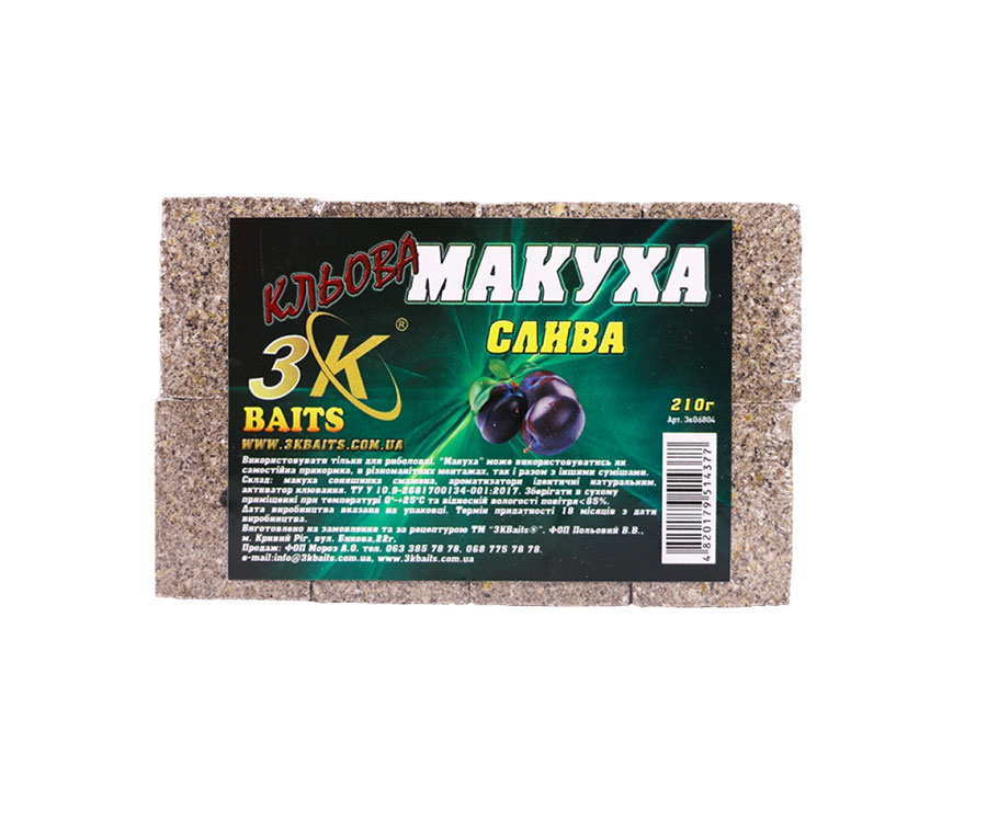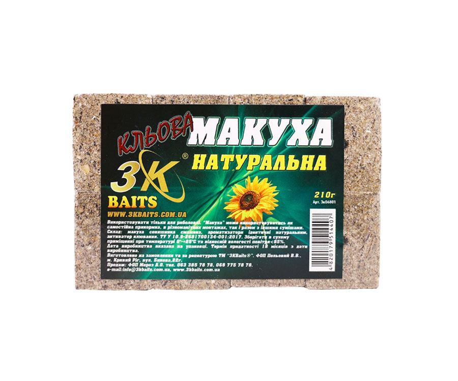 Макуха(полуниця) від 3KBaits — пресовані кубики смаженої макухи з отвором для зручнішого використання. Завдяки натуральному складу, дають можливість притягати рибу за короткий відрізок часу і утримувати її в місці ловлі, як в теплій, так і в холодній воді. Можливо використовувати як самостійно, так і в комплексі з іншими кормами.