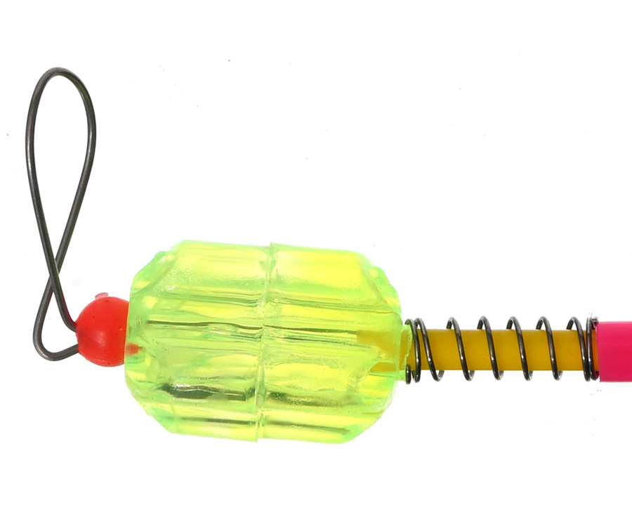 Механічний індикатор клювання виготовлено з міцного пластику. На його пластиковому стрижні закріплено яскраву прозору головку з отворами під світлячки різного діаметра (до 4,5 мм). З обох боків сигналізатора розміщено дротяні швидкороз'ємні петлі для кріплення аксесуара до жилки вудлища між першим (приймальним) і другим кільцем. Завдяки важкій головці та продуманій конструкції індикатор не розгойдується від вітру та слугує чудовим сигналізатором клювання як у денний, так і в нічний час.