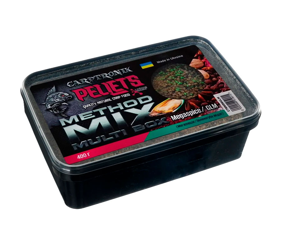 Carptronik Method Mix Multi Box – серія преміальних прикормочних міксів, які призначено для метод-фідерної ловлі. Гранули суміші Carptronik Method Mix Multi Box складаються з високоякісних натуральних інгредієнтів і мають високу привабливість та харчову цінність для риби. У комплекті із 400 г суміші пелетсів Carptronik Method Mix постачається 100 мл ліквіду для замішування прикормки. Зволожений ліквідом пелетс чудово формується в прес-формі, відмінно тримається в годівниці. Він добре тоне та залишається на дні поруч із насадкою, поширюючи у воді цінні поживні речовини та насичений аромат, у надзвичайний спосіб стимулюючи апетит риби. Робоча суміш Carptronik Method Mix Multi Box містить високий рівень натуральних атрактантів і стимуляторів клювання, які ефективно приваблюють рибу в будь-яку пору року. Продукцію можна застосовувати як у фідерній, так і в короповій риболовлі.