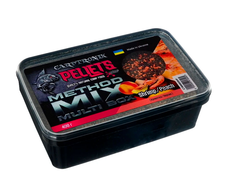 Carptronik Method Mix Multi Box – серія преміальних прикормочних міксів, які призначено для метод-фідерної ловлі. Гранули суміші Carptronik Method Mix Multi Box складаються з високоякісних натуральних інгредієнтів і мають високу привабливість та харчову цінність для риби. У комплекті із 400 г суміші пелетсів Carptronik Method Mix постачається 100 мл ліквіду для замішування прикормки. Зволожений ліквідом пелетс чудово формується в прес-формі, відмінно тримається в годівниці. Він добре тоне та залишається на дні поруч із насадкою, поширюючи у воді цінні поживні речовини та насичений аромат, у надзвичайний спосіб стимулюючи апетит риби. Робоча суміш Carptronik Method Mix Multi Box містить високий рівень натуральних атрактантів і стимуляторів клювання, які ефективно приваблюють рибу в будь-яку пору року. Продукцію можна застосовувати як у фідерній, так і в короповій риболовлі.
