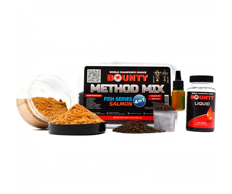 Bounty Method Mix 4 в 1 – оптимальний удосконалений мікс від дворазових чемпіонів світу з риболовлі на коропа – Клубу Кричевичі. Всі компоненти Bounty Method Mix - натуральні, мають підвищену поживність: амінокислоти, мінерали, масляна кислота, ферменти, вітамінний комплекс і безліч інших корисних інгредієнтів, які так подобаються коропу. Все для того, щоб ви завжди поверталися з водойм з трофеями.