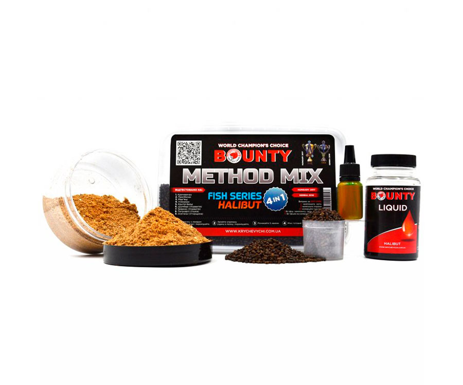 Набір харчування для лову коропа на флет-фідер від компанії BOUNTY. У набір входять: прикормочной пеллетс, ліквідує і флюорісцірующій сироп. Всі компоненти Bounty Method Mix - натуральні, мають підвищену поживністю: амінокислоти, мінерали, масляна кислота, ферменти, вітамінний комплекс і безліч інших інгредієнтів корисних і улюблених коропами. У пластиковому коробі знаходиться 400 грам пеллетса + ліквід + сироп. В асортименті двадцять різних смаків.