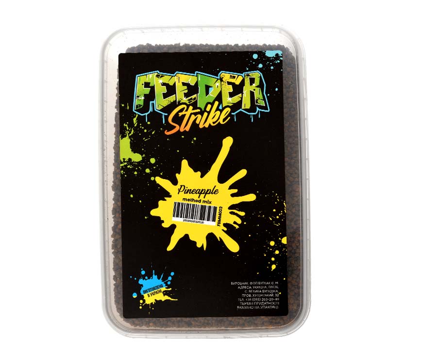 Feeder Strike Method Mix Pineapple – це метод мікс суміші складного важкого запаху та високої поживності, який у складі має гранули з легким ароматним бісквітом, просоченим високоякісною солодкою ананасовою аромою. При нагоді, візьми цю суміш на водойму, де багато амурів, невеликих коропів та карасів. Мікс під час змочування стає більш жовтого кольору й за сонячної погоди просто світиться на дні в точці ловлі, де риба його дуже швидко знаходить. А якщо будеш використовувати Pineapple Method Mix на мілинах (так званих «банках») або закидати флет-годівницю акуратно під протилежний берег із навислою над водою прибережною рослинністю, тобі точно скоро почнуть заздрити всі сусіди-рибалки. Це суміш №1 для Freestyle method feeder по теплій воді!