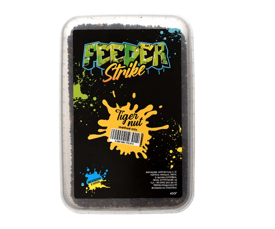 Feeder Strike Method Mix Mix Tiger Nut – це саме той метод мікс, з яким ваша риболовля буде результативною та цікавою. Якщо місце ловлі вибрано правильно – риба обов'язково ним зацікавиться. Завдяки великій кількості поживних складових і привабливих атрактантів суміш швидко створює привабливу хмаринку поживної каламуті в точці ловлі. Найкращим чином мікс підійде для швидкого приваблення та ловлі коропа, амура, карася та іншої великої риби! Ідеально підходить для ловлі класичним фідером, флет-фідером і Freestyle method feeder.