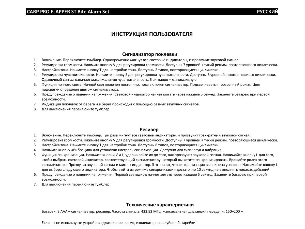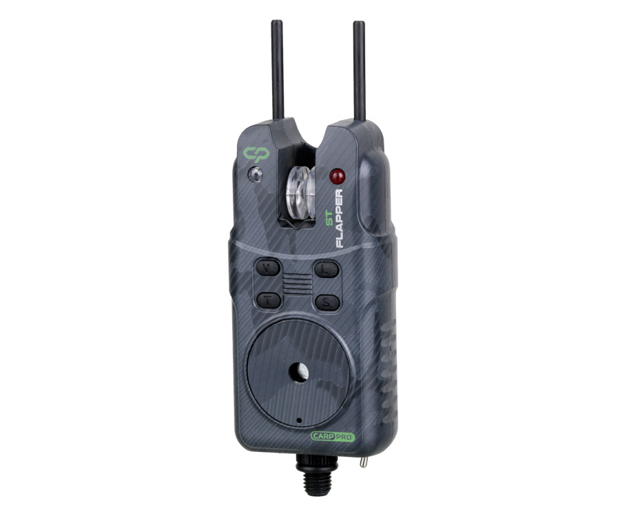 Carp Pro Flapper ST - надійні, зручні та сучасні сигналізатори покльовки від відомого бренду. Для зручності транспортування та зберігання електронні сигналізатори поставляються в жорстких пластикових чохлах, що захищають їх від пошкоджень. У комплект входять самі сигналізатори, ресивер зі шнурком для перенесення та знімні бічні фіксатори. Flapper ST виконані в уже знайомій багатьом любителям коропового лову, стильному камуфляжному забарвленні компанії Carp Pro. Ввімкнення сигналізаторів та ресивера проводиться за допомогою тумблера: за матеріальним становищем його важеля можна легко визначити включені вони чи вимкнені. Ролик сигналізатора прозорий та підсвічується. Світлодіоди-індикатори клювання дуже яскраві і добре помітні як вночі, так і вдень. Білий світлодіод показує клювання в берег, кольоровий - від берега. Кожен сигналізатор має 8 режимів тональності, 8 режимів гучності і 6 режимів чутливості. На передній панелі розташовані 4 кнопки, за допомогою яких здійснюються регулювання звуку, тональності, чутливості, перемикання в режим «нічний» та ін. Кожен сигналізатор має функцію пам'яті, що дає можливість запам'ятати всі поточні настройки і не налаштовувати сигналізатор «з нуля» на наступній риболовлі. Передбачений нічний режим, при включенні якого підсвічується ролик сигналізатора. Перед роликом встановлена металева скоба, що запобігає пропилювання корпусу жилкою при покльовках в берег. Сигналізатори мають високий вологозахистом. Оснащені роз'ємом для підключення механічних сигналізаторів клювання. Дальність роботи ресивера: до 200 метрів. На його передній панелі розташовані відповідні кожному з сигналізаторів світлодіоди-індикатори клювання. Також там є 4 кнопки для налаштування звуку, тональності, установки режимів «вібро» та ін. Харчування сигналізаторів та ресивера здійснюється від трьох елементів AAA напругою 1,5 В. При заміні батарейок настройки скидаються. CarpPro Flapper ST випускаються в двох наборах: - 3 + 1: червоний, синій, зелений + ресивер; - 4 + 1: червоний, синій, зелений, жовтий + ресивер. Ці сигналізатори підійдуть під будь-які умови лову як початківцям, так і професійним риболовам коропа, та ніколи вас не підведуть! Завантажити інструкцію з експлуатації