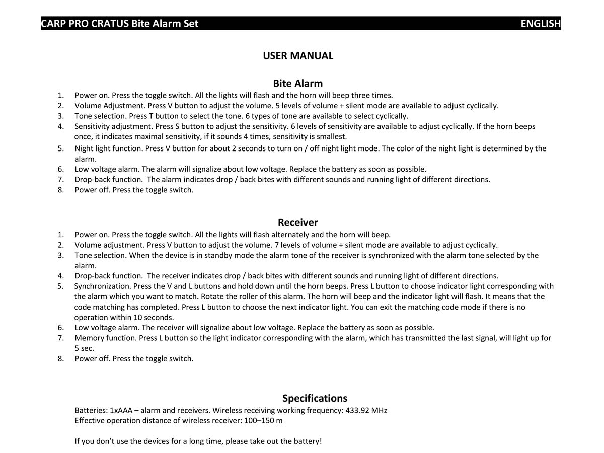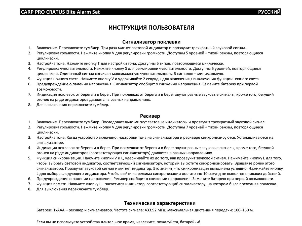 Для живлення ресивера і сигналізаторів використано один елемент ААА з напругою 1,5 В. Напівжорсткий кейс на блискавці виконано з міцного синтетичного матеріалу. Він надійно захищає електронні пристрої Carp Pro Cratus 4+1 від пилу й вологи.
