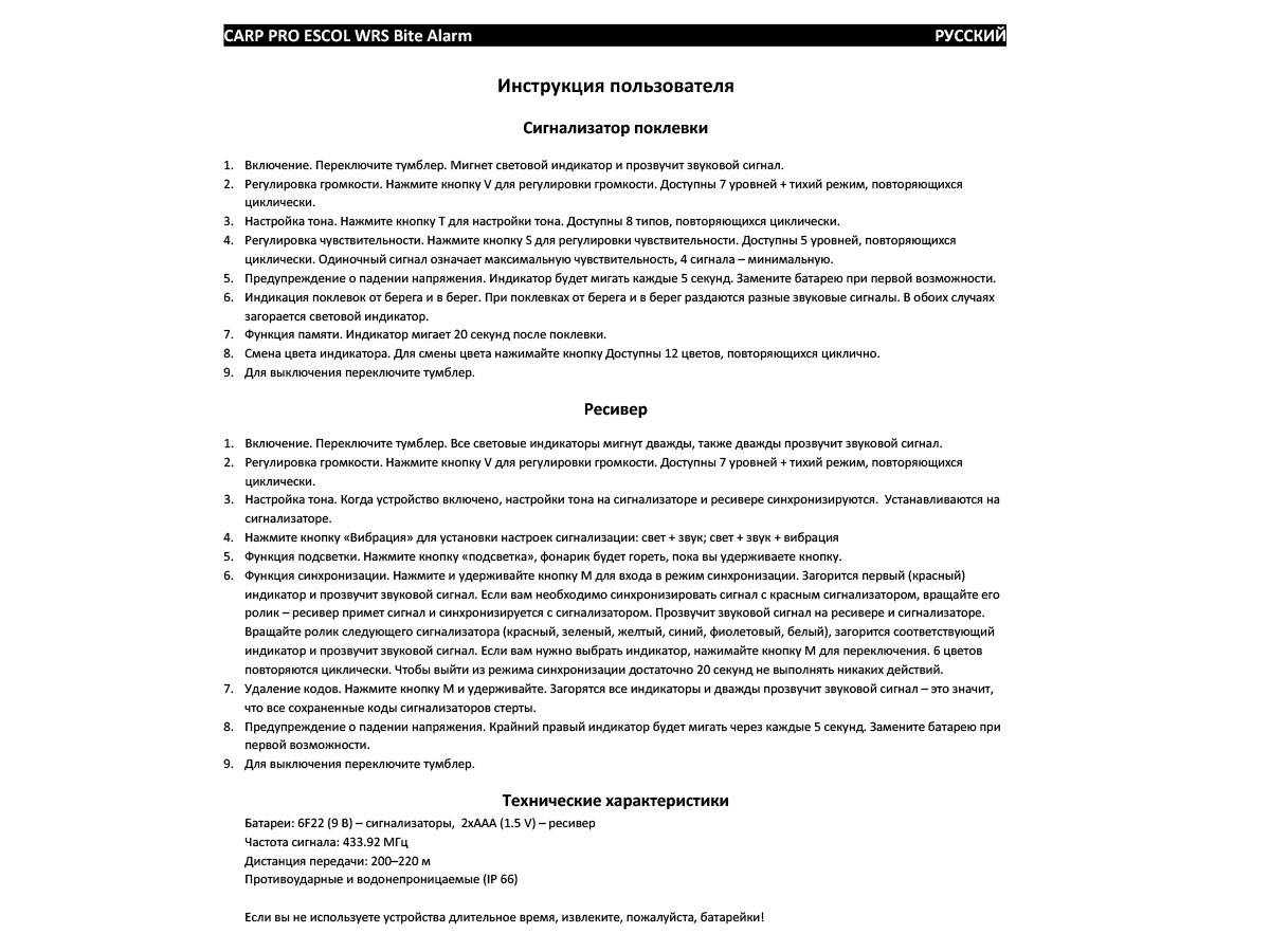 До ресивера можна підключити 6 сигналізаторів клювання Carp Pro Escol WRS. Дальність роботи ресивера: до 220 метрів. На його передній панелі розташовано відповідні кожному з сигналізаторів світлодіоди-індикатори клювання. Там же є кнопки для налаштування звуку, встановлення режимів «вібро», «тихий», «синхронізація» та ін. Передбачено опції «ліхтарик», «стирання кодів сигналізаторів», попередження про недостатній заряд елемента живлення та ін. Ресивер укомплектовано брендованим шнурком.