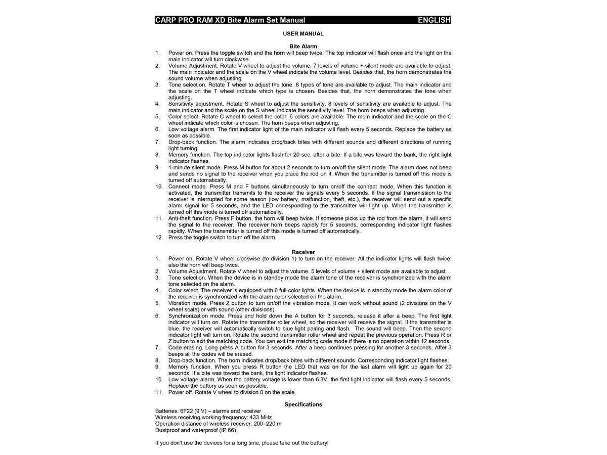 Увімкнення/вимкнення сигналізаторів здійснюється тумблером, а керування функціями – регуляторами-потенціометрами. Кожен сигналізатор має 7 рівнів гучності + тихий режим, 8 режимів налаштування тональності, 8 режимів чутливості та 6 варіантів налаштування кольору світлодіодного індикатора. На передній панелі розташовано 4 регулятори (коліщатка), за допомогою яких здійснюються регулювання звуку, тональності, чутливості, вибір кольору індикатора. Світлодіоди-індикатори дуже яскраві, їх добре видно як вночі, так і вдень. Крім двох верхніх світлодіодів, передбачено великий основний індикатор із 8 світлодіодів, що розташовані по колу. Індикація клювання від берега та в берег відбувається за допомогою різних звукових сигналів і різного напрямку обертання світла, що біжить, на основному індикаторі. Передбачено функцію попередження про низький рівень заряду елемента живлення: під час включення сигналізатора основний індикатор показує рівень заряду кількістю працюючих світлодіодів. Кожен сигналізатор має функцію пам'яті – верхні індикаторні вогні горять 20 секунд після клювання. Якщо клювання було в напрямку берега, то блимає правий індикатор. Крім того, передбачено функції «Антикрадіжка», «Режим зв'язку», «Тихий режим». У «Тихому режимі» сигналізатор не подаватиме звуковий сигнал і не передаватиме сигнал на ресивер протягом однієї хвилини – доки ви встановлюватимете вудлище. Carp Pro RAM XD обладнано роз'ємом для підключення індикаторів клювання. Вони мають високий пило- та вологозахист – IP 66. Варіанти кольору сигналізатора: яскраво-фіолетовий, червоний, жовтий, синій, зелений, фіолетовий.