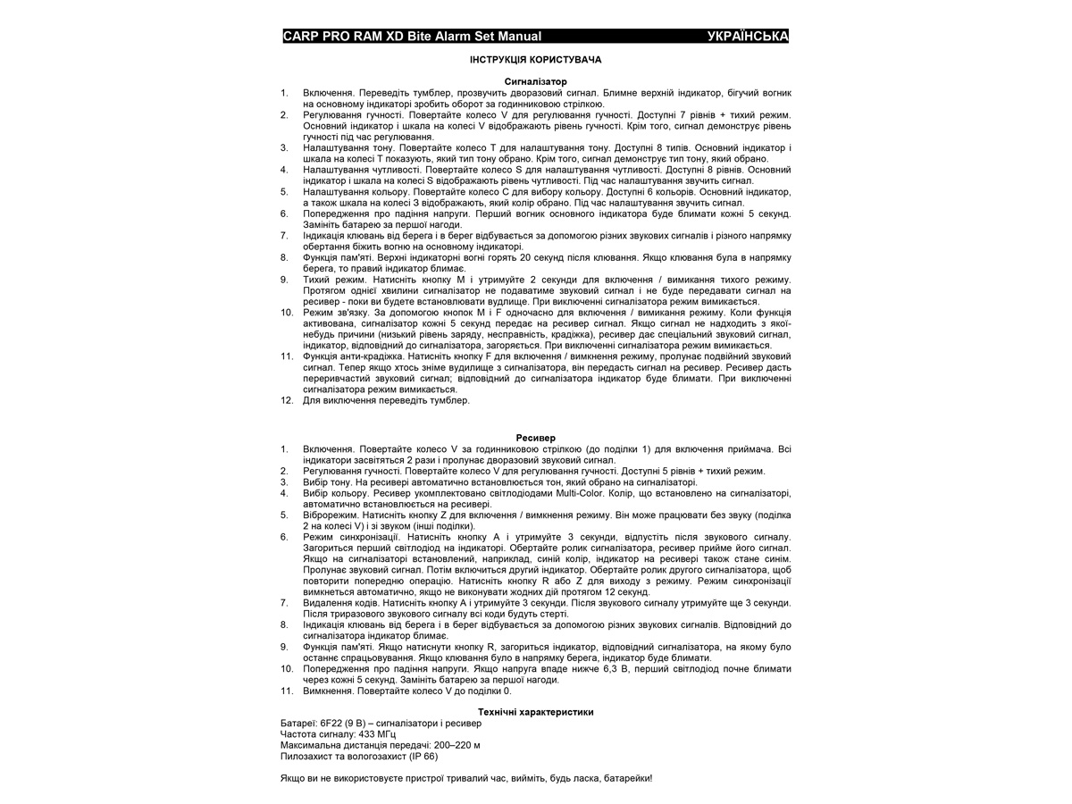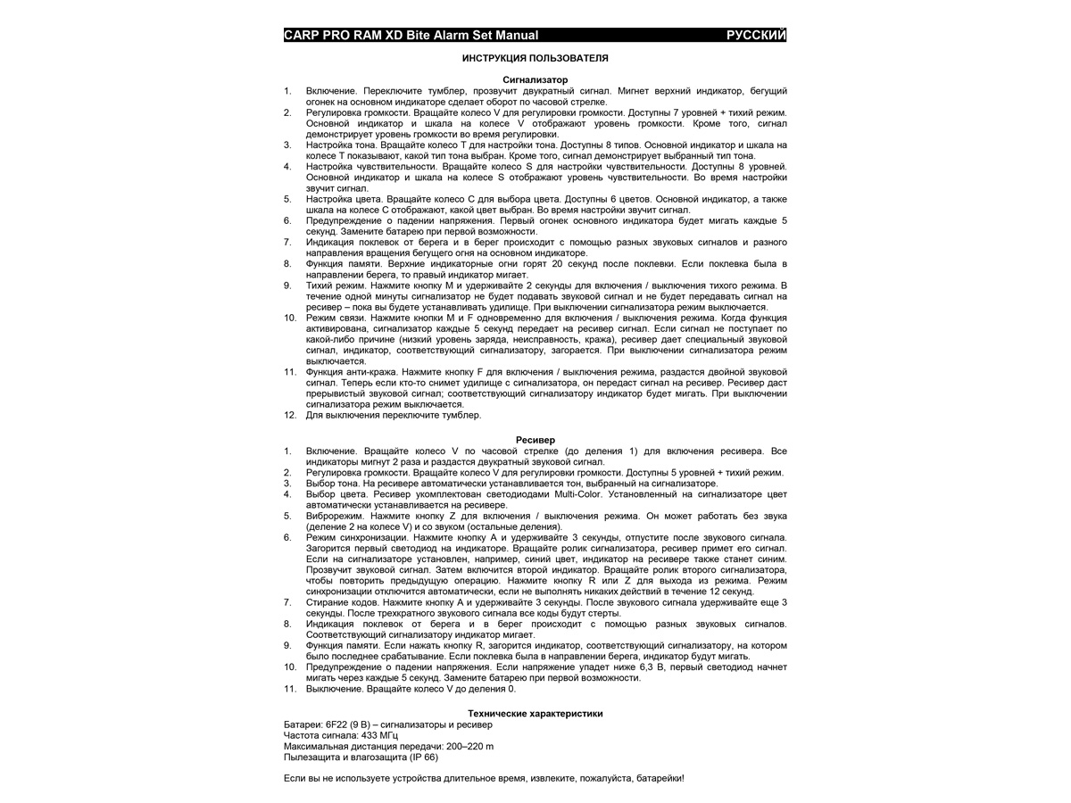Увімкнення/вимкнення сигналізаторів здійснюється тумблером, а керування функціями – регуляторами-потенціометрами. Кожен сигналізатор має 7 рівнів гучності + тихий режим, 8 режимів налаштування тональності, 8 режимів чутливості та 6 варіантів налаштування кольору світлодіодного індикатора. На передній панелі розташовано 4 регулятори (коліщатка), за допомогою яких здійснюються регулювання звуку, тональності, чутливості, вибір кольору індикатора. Світлодіоди-індикатори дуже яскраві, їх добре видно як вночі, так і вдень. Крім двох верхніх світлодіодів, передбачено великий основний індикатор із 8 світлодіодів, що розташовані по колу. Індикація клювання від берега та в берег відбувається за допомогою різних звукових сигналів і різного напрямку обертання світла, що біжить, на основному індикаторі. Передбачено функцію попередження про низький рівень заряду елемента живлення: під час включення сигналізатора основний індикатор показує рівень заряду кількістю працюючих світлодіодів. Кожен сигналізатор має функцію пам'яті – верхні індикаторні вогні горять 20 секунд після клювання. Якщо клювання було в напрямку берега, то блимає правий індикатор. Крім того, передбачено функції «Антикрадіжка», «Режим зв'язку», «Тихий режим». У «Тихому режимі» сигналізатор не подаватиме звуковий сигнал і не передаватиме сигнал на ресивер протягом однієї хвилини – доки ви встановлюватимете вудлище. Carp Pro RAM XD обладнано роз'ємом для підключення індикаторів клювання. Вони мають високий пило- та вологозахист – IP 66. Варіанти кольору сигналізатора: яскраво-фіолетовий, червоний, жовтий, синій, зелений, фіолетовий.