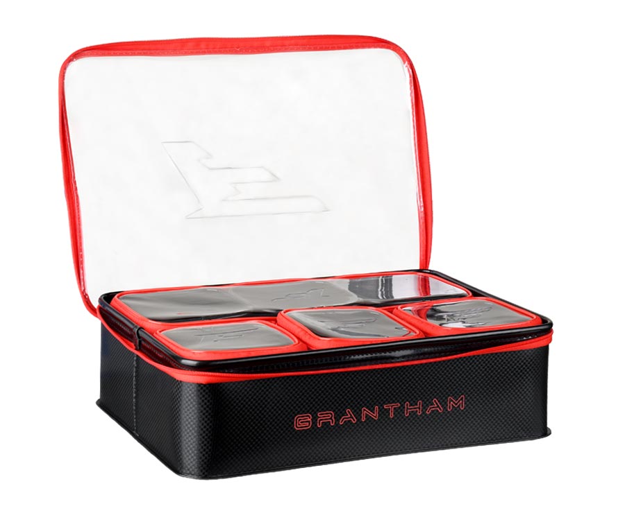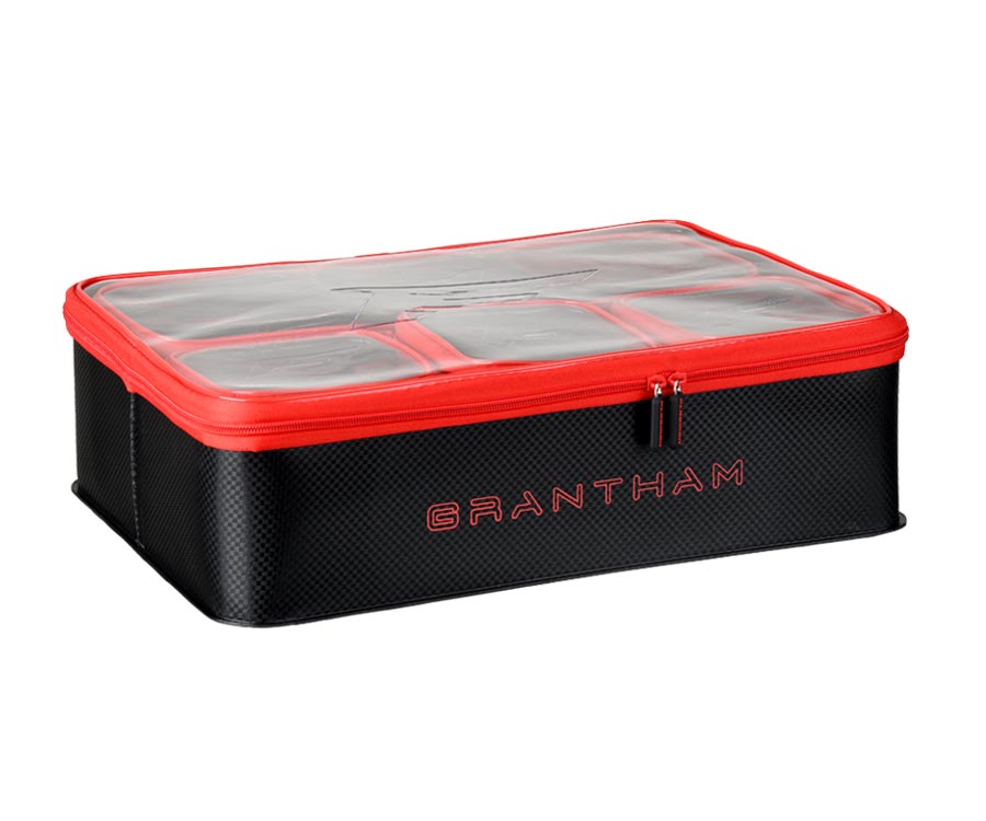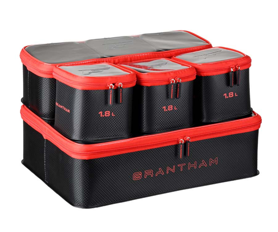 Flagman Grantham Woven Eva Set 7+1 – набір ємностей для зберігання приманок. Складається з основної ємності 15 л (45x33x13 см), в якій розташовано чотири ємності меншого розміру: три невеликих квадратних 1,8 л (14x14x12 см) і одна велика прямокутна 6 л (43x15x12 см), в якій розміщуються ще три квадратних ємності 1,8 л (14x14x12 см) без кришок. Основна ємність і чотири менших мають прозорі кришки, що значно полегшує ідентифікацію їх вмісту. Всі кришки закриваються на двосторонні блискавки. Ємності виготовлено з EVA зі спеціальним армуючим покриттям WOVEN EVA. Вони легко очищаються від забруднень, не пропускають воду, не накопичують запахи.