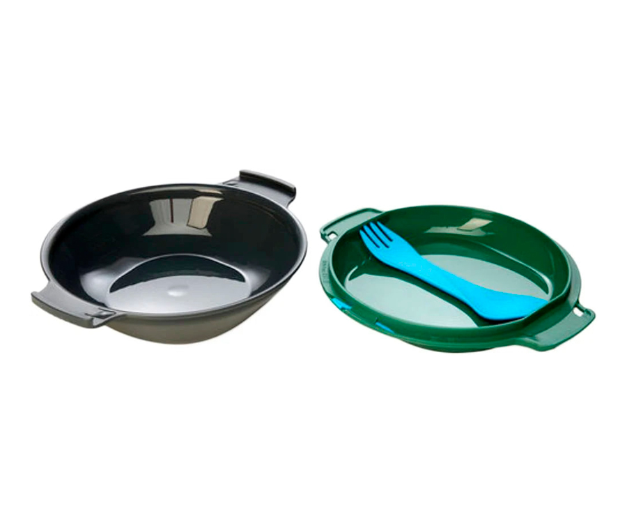 До комплекту входять: миска, тарілка, виделка, ложка, зубочистка. Миска і тарілка надійно замикаються для зручності транспортування. Отвір на ручці для карабіна. Посуд виготовлено з міцних, безпечних для здоров'я матеріалів, які легко миються і стійкі до пошкоджень. Усі елементи набору легко вкладаються в компактний кейс, що робить його зручним для транспортування та зберігання.