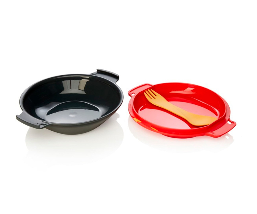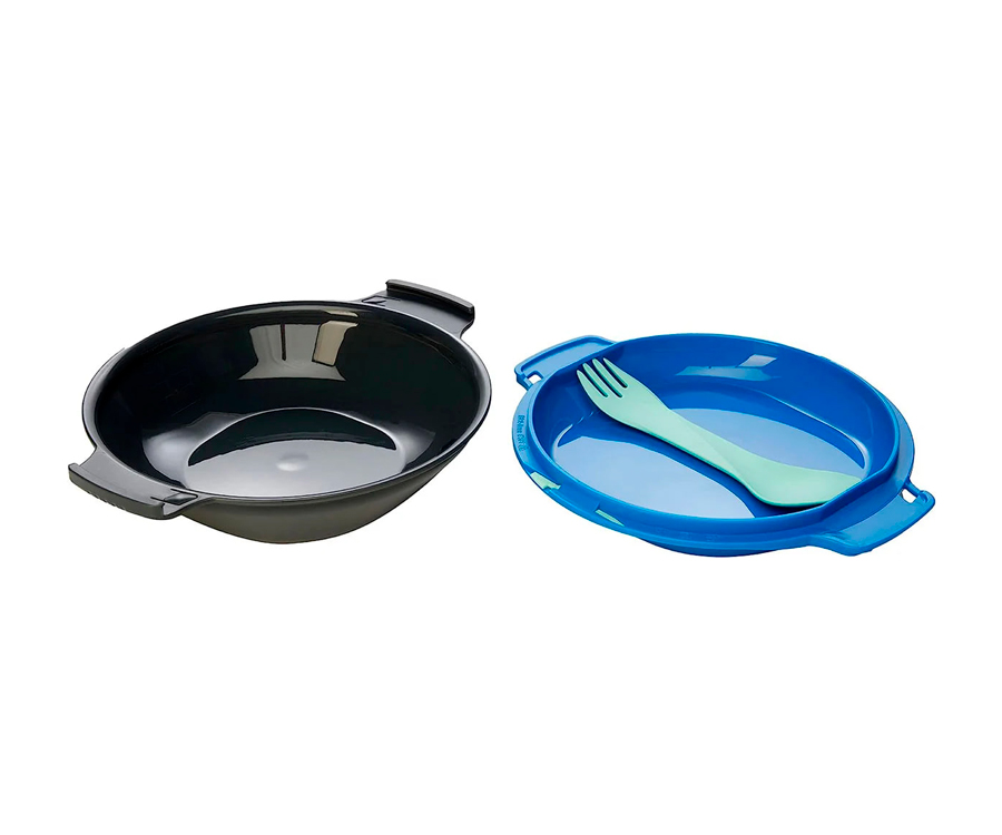 До комплекту входять: миска, тарілка, виделка, ложка, зубочистка. Миска і тарілка надійно замикаються для зручності транспортування. Отвір на ручці для карабіна. Посуд виготовлено з міцних, безпечних для здоров'я матеріалів, які легко миються і стійкі до пошкоджень. Усі елементи набору легко вкладаються в компактний кейс, що робить його зручним для транспортування та зберігання.