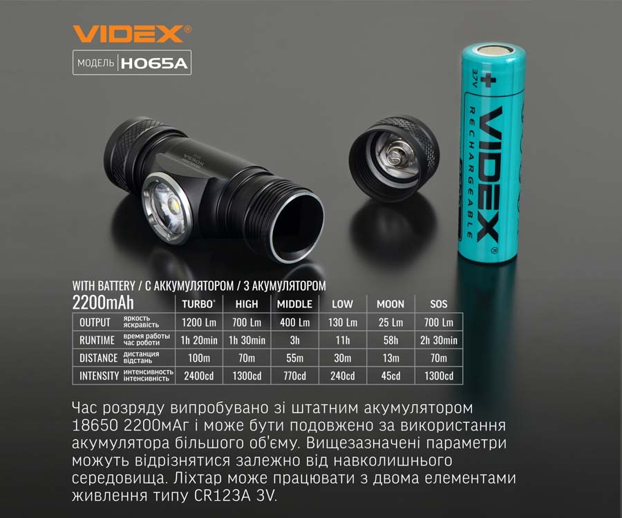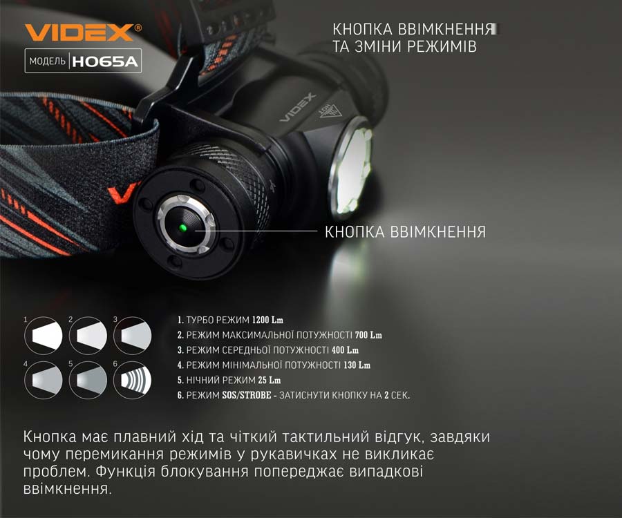 Налобний світлодіодний ліхтарик VLF-H065A 1200Lm 5000K призначений для індивідуального використання у темний час доби або у приміщеннях без освітлення. Розроблений спеціально для активного відпочинку та занять такими видами спорту як біг, трейловий біг, походи, велоспорт. Дозволяє вибрати потрібний режим роботи. Максимальна яскравість – 1200Lm. Замість рефлектора використовується оптична лінза, яка створює бічне засвітлення та центральний промінь далекого світла, що дуже важливо при швидкому русі.