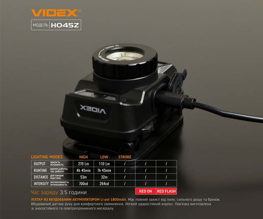 Налобний світлодіодний ліхтарик H045Z VIDEX 270Lm 5000K призначений для індивідуального використання в темний час доби або в приміщеннях без освітлення. Основними показниками є герметичність, надійний корпус, дальність світла. Дозволяє обрати необхідний режим роботи. Максимальна яскравість 270Lm. Регульований кут нахилу кріплення дозволяє обрати зручний кут освітлення. Вбудований датчик руху для комфортного увімкнення.