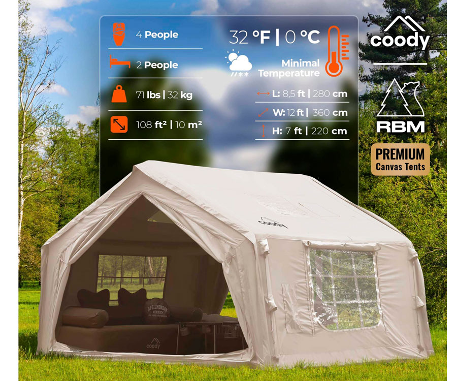 Окремо слід відзначити знімний підлоговий тент – це рішення дозволяє перетворити Coody AIR Tent 10 в зручний відкритий навіс, наприклад для обіду в тіні або роботи на свіжому повітрі. Підлоги виготовлені з високоякісних матеріалів, використовуваних в суднобудуванні, з герметичними швами і інтегрованими вибухостійкими повітряними каналами. Все продумано до дрібниць.