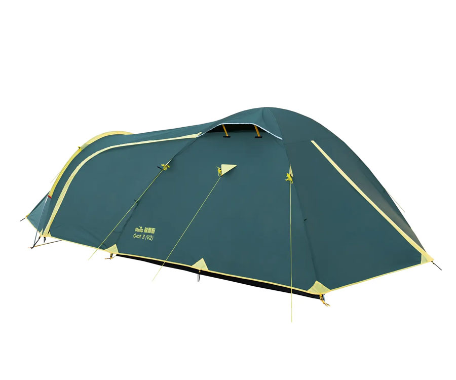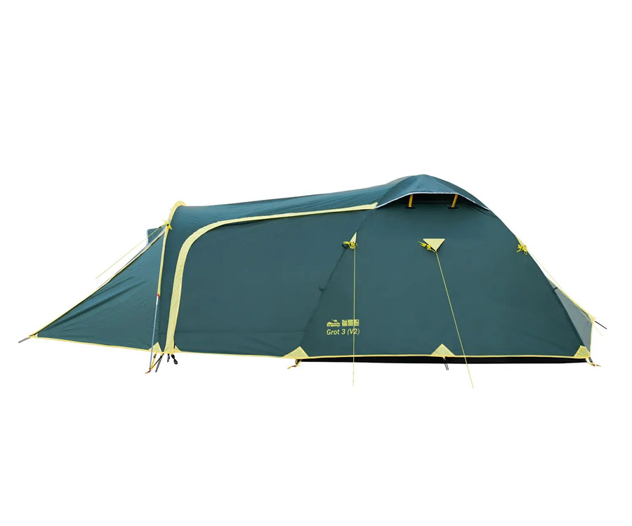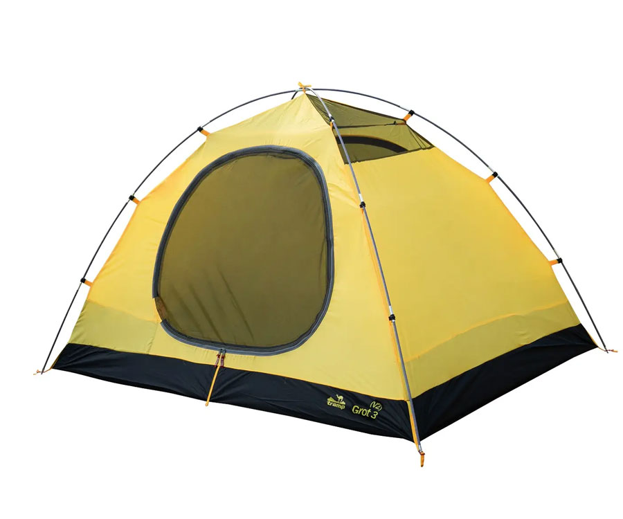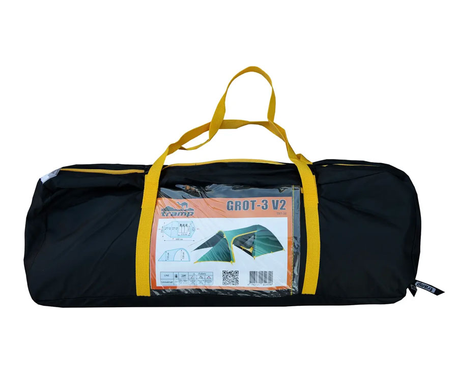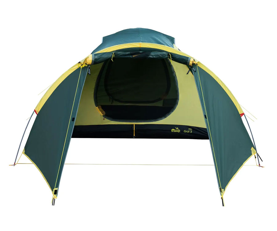 Намет Tramp Grot 3 V2 TRT-036 – універсальний туристичний намет із 3 входами (2 через тамбур - бічний і торцевий, й один із тильного боку) та великим вантажним переднім тамбуром. Усі входи в спальне відділення продубльовано москітними сітками. Місткість намету: 3+1 людини. Площа тамбура дає змогу зручно розмістити рюкзаки, готувати їжу на пальниках у негоду й навіть, за потреби, прийняти кількох гостей. Намет має 2 вентиляційні клапани у верхній частині купола зовнішнього тенту, з регульованою за висотою стійкою. Усі шви намету проклеєно. Призначення: риболовля, полювання, туризм, кемпінг. Період використання: весна-літо-осінь.