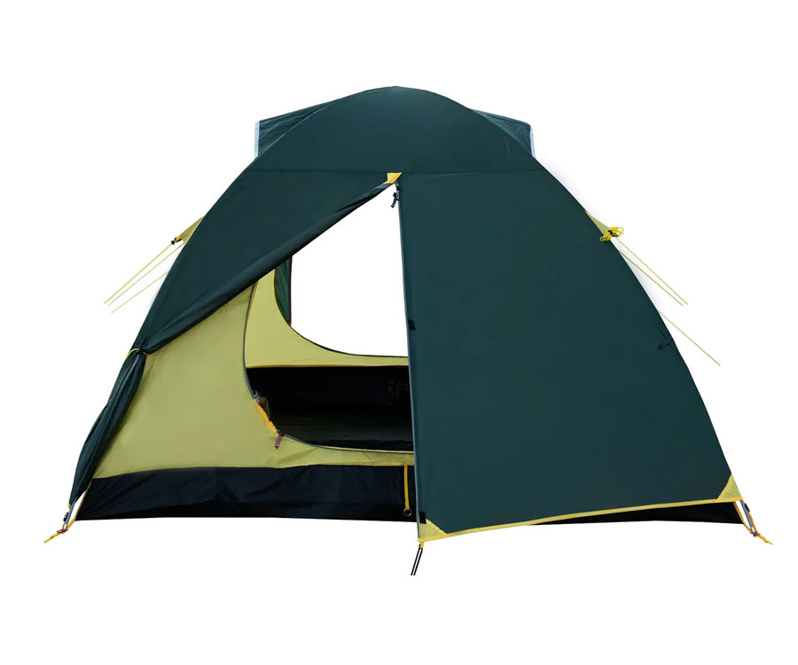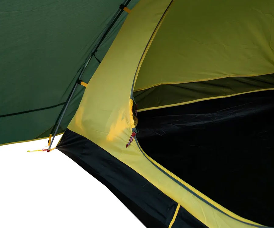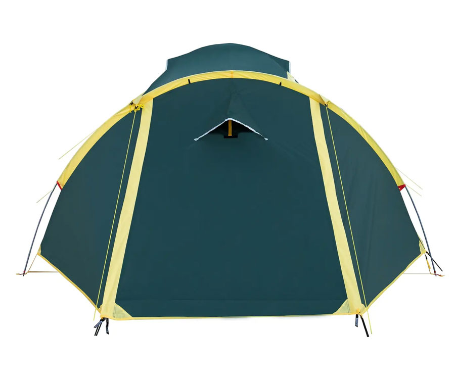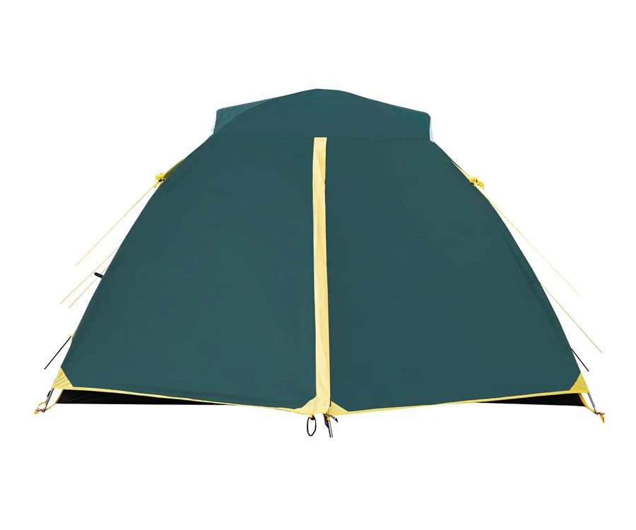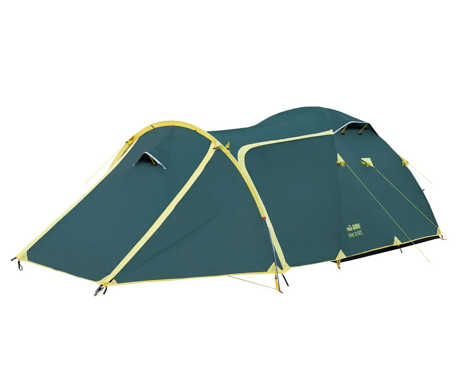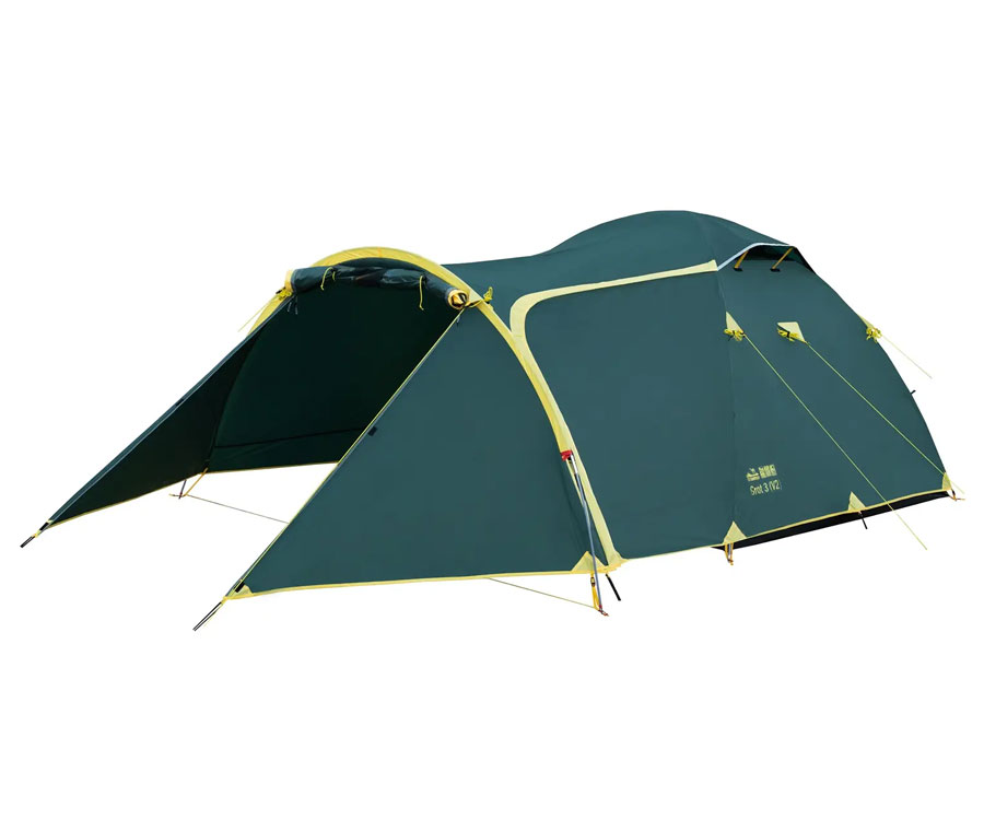 Намет Tramp Grot 3 V2 TRT-036 – універсальний туристичний намет із 3 входами (2 через тамбур - бічний і торцевий, й один із тильного боку) та великим вантажним переднім тамбуром. Усі входи в спальне відділення продубльовано москітними сітками. Місткість намету: 3+1 людини. Площа тамбура дає змогу зручно розмістити рюкзаки, готувати їжу на пальниках у негоду й навіть, за потреби, прийняти кількох гостей. Намет має 2 вентиляційні клапани у верхній частині купола зовнішнього тенту, з регульованою за висотою стійкою. Усі шви намету проклеєно. Призначення: риболовля, полювання, туризм, кемпінг. Період використання: весна-літо-осінь.