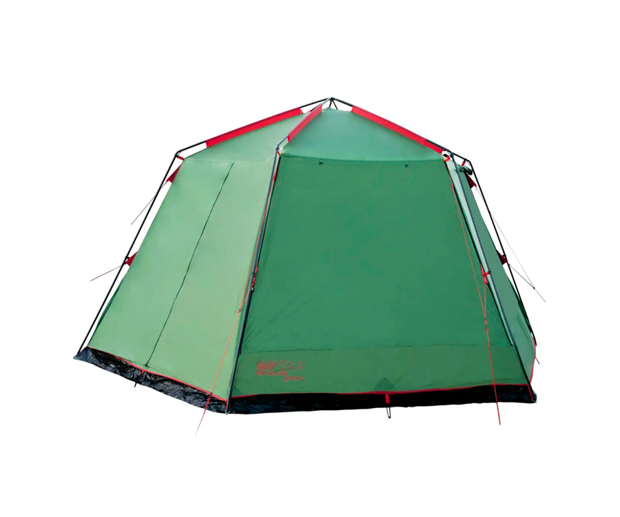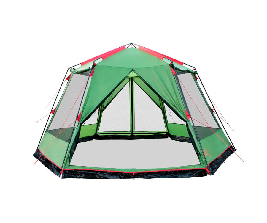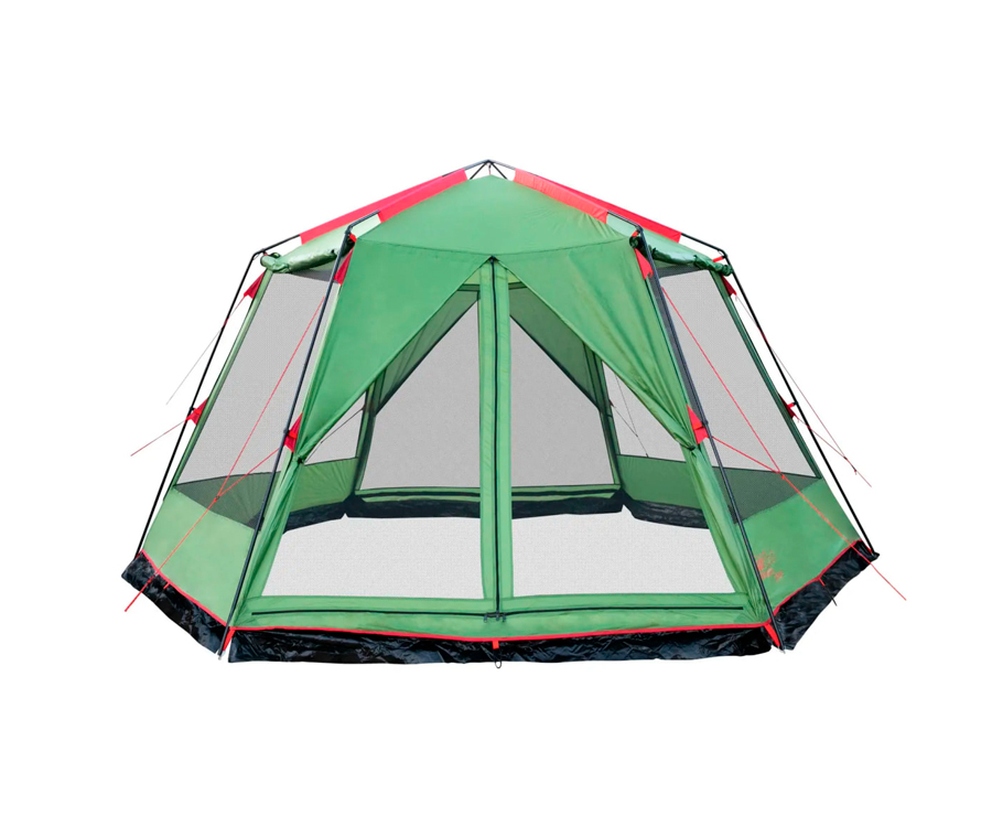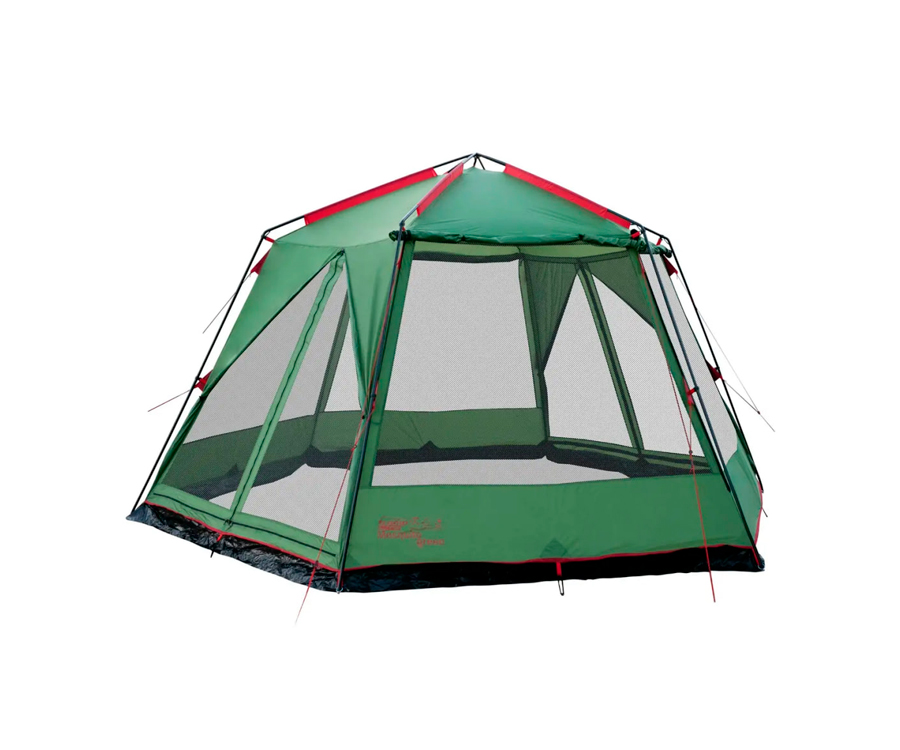 Просторий кемпінговий тент-намет Tramp у формі шестикутника, укріплений міцною сталевою конструкцією. Якщо вам потрібно обладнати місце для їдальні або зібрати групу туристів у таборі, цей тент - ідеальне рішення. Тент оснащений по периметру протимоскітною сіткою, завдяки чому ви будете надійно укриті від докучливих комах. Матеріал, з якого виготовлений тент, просочений спеціальним складом, що запобігає поширенню вогню. Тент-намет міцно кріпиться до металевих стійок, розташованих по периметру, і має два входи. Для встановлення або розбирання тенту Mosquito вам знадобиться мінімум часу. Конструкція каркаса не передбачає елементів, що згинаються, які з часом мають властивість руйнуватися.