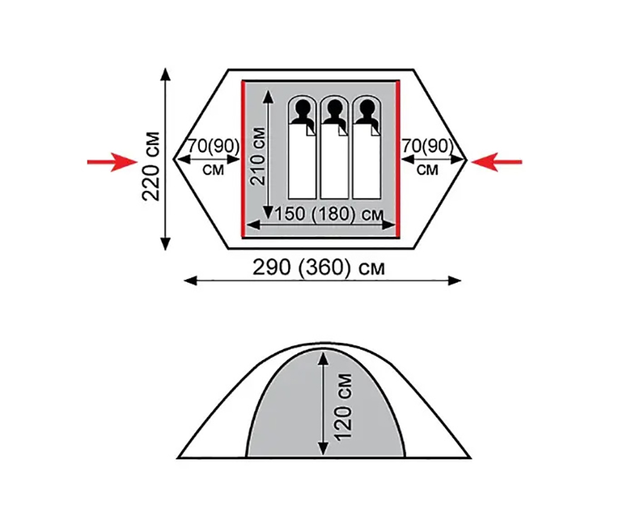 Додаткова консльна дуга збільшує площу та внутрішній об’єм тамбуру, підвищує вітростійкість та вітрообтічність намету. Забезпечена сніговою спідницею.