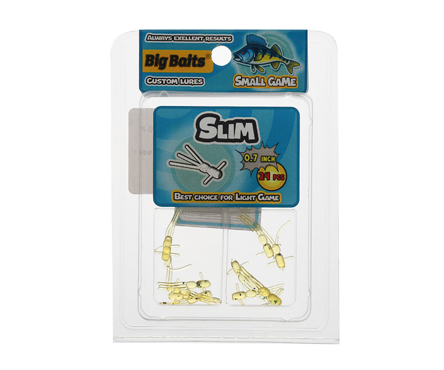 Силіконова приманка Big Baits Slim 0,7" має невелике тіло оригінальної геометрії у формі личинки комахи з трипроменевим подовженим хвостом, що створює мікроколивання і провокує на атаку навіть пасивну рибу. Мікроприманку Big Baits Slim створено для наноджигу та зимової риболовлі. Незважаючи на свої мініатюрні розміри, вона приваблює як велику, так і дрібну рибу. Big Baits Slim виготовлено з дуже м'якого еластичного матеріалу, вона має яскраво виражений натуральний запах, який додатково посилює її привабливість. Випускається в розмірі 0,7 дюйма з різними кольорами, світінням і без. Рекомендовано зберігати приманки в оригінальному пакуванні, що надає їм довговічності та тривалий час зберігає запах атрактанту. В упаковці: 24 шт.