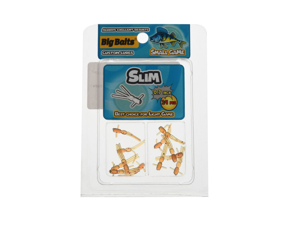 Силіконова приманка Big Baits Slim 0,7" має невелике тіло оригінальної геометрії у формі личинки комахи з трипроменевим подовженим хвостом, що створює мікроколивання і провокує на атаку навіть пасивну рибу. Мікроприманку Big Baits Slim створено для наноджигу та зимової риболовлі. Незважаючи на свої мініатюрні розміри, вона приваблює як велику, так і дрібну рибу. Big Baits Slim виготовлено з дуже м'якого еластичного матеріалу, вона має яскраво виражений натуральний запах, який додатково посилює її привабливість. Випускається в розмірі 0,7 дюйма з різними кольорами, світінням і без. Рекомендовано зберігати приманки в оригінальному пакуванні, що надає їм довговічності та тривалий час зберігає запах атрактанту. В упаковці: 24 шт.