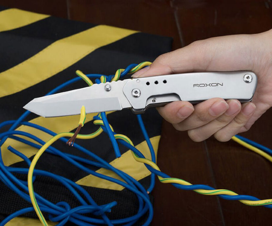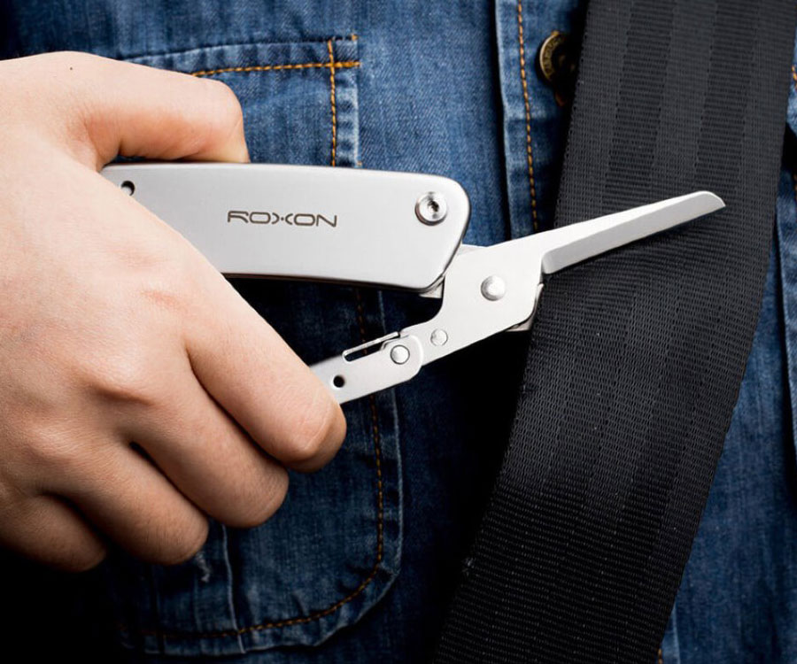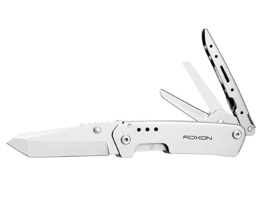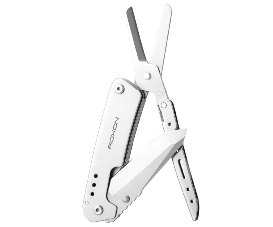 Ніж-ножиці Roxon KS S501 - мультитул-ніж із додатково вбудованими ножицями. Інструмент підходить для щоденного використання та поїздок на природу. Модель Knife-scissors KS S501 від компанії Roxon призначена для тих ситуацій, коли може знадобитися не тільки ніж, але і ножиці. Наприклад, вона сподобається рибалкам. Цей інструмент поєднує дві функції, головною з яких є саме ніж. Лезо клинка набуло форми American tanto. У нього гладко заточена кромка різу з практично прямою лінією та різким підйомом до вістря. Обух ножа зроблений зі скосом, що створює ефект фальшлеза. Ближче до ручки на спинці ножа зроблено кілька негострих напівкруглих зазубрин, які потрібні для більш надійного упору пальця. Довжина клинка дорівнює 7,5 см. Ніж дістається з рукоятки за допомогою невеликого шпенька на лезі. Ножиці мають довжину 4,6 см без урахування ручок, але цього цілком достатньо, щоб працювати ними було зручно. Вони дістаються на звороті рукоятки. Цей інструмент підійде для розрізання тканини і шкіри, а згодом ножиці можна буде заново підточити. Обидва функціональні інструменти, як і рукоятка Knife-scissors KS S501 виготовлені зі сталі 5Cr15MoV. Це нержавіючий сплав із вмістом вуглецю 0,45-0,55%, хрому – 14-15% та марганцю – 1%. Це зробило метал стійким до корозії та досить твердим, щоб довго зберігати гостре заточення. За ним не складно доглядати, адже достатньо стежити, щоб інструмент після використання зберігався сухим та чистим. У складеному стані мультитул-ніж має довжину 10,4 см. Він важить 138 г. На одній із сторін рукоятки до металу прикручена притискна кліпса, що дозволяє носити ніж на ремені. Продається ця модель у кортонній коробці, що виглядає досить презентабельно, щоб її можна було купувати на подарунок.