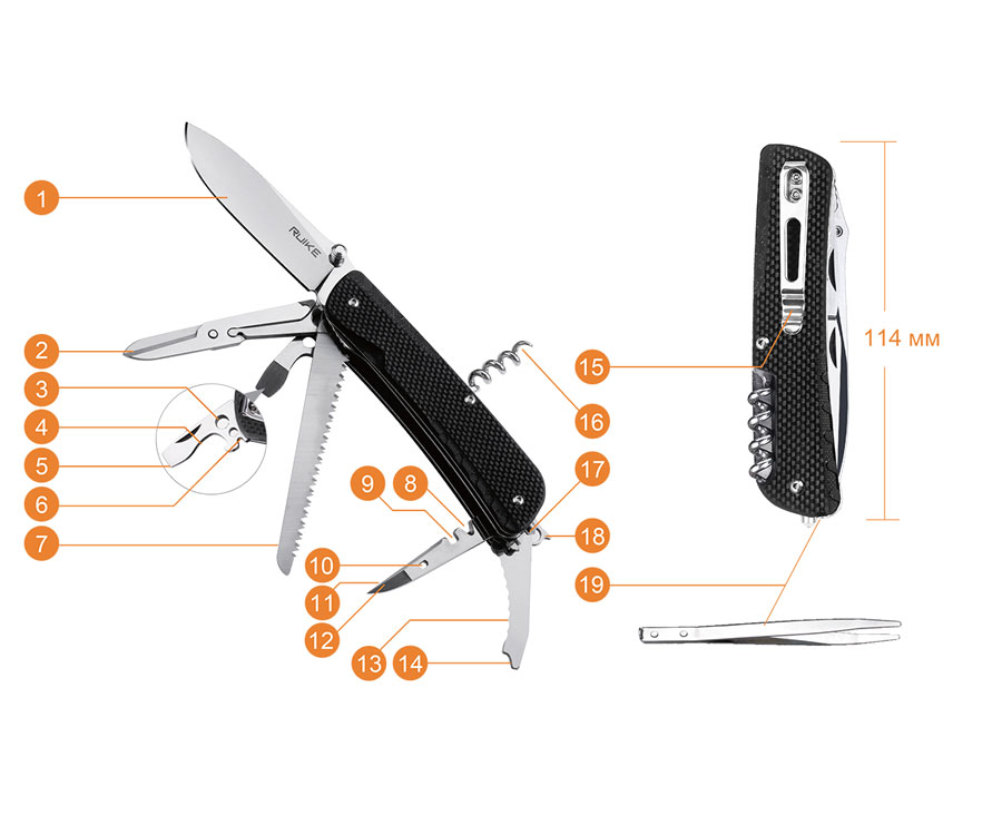 Багатофункціональний ніж Ruike LD42 надасть змогу впоратися з будь-якою роботою, що може виникнути в туристичному поході, на риболовлі, полюванні, під час пікніка. Модель Ruike LD42 може виконувати 19 різних операцій завдяки цілому комплекту вбудованих інструментів. Цей ніж легко замінює ящик звичайних інструментів і водночас без проблем вміщується в кишеню. Всі інструменти зроблено зі шведської нержавіючої сталі марки 12С27. На відміну від більшості нержавіючих сплавів, ця сталь є дуже твердою – до 59 HRC, що дає змогу ножу чудово зберігати заточку. Розмір леза – 85 мм. Клинок зроблено міцним і надійним з обухом завтовшки 3 мм. Такий ніж легко витримує великі навантаження. Для безпеки в Ruike LD42 вбудовано один із найбільш надійних замків із лінійною конструкцією – Liner lock. Він забезпечує жорстку фіксацію та не дає змоги лезу складатися доти, доки користувач не зрушить фіксатор вручну. Заточка Plain забезпечує абсолютно рівну ріжучу кромку.