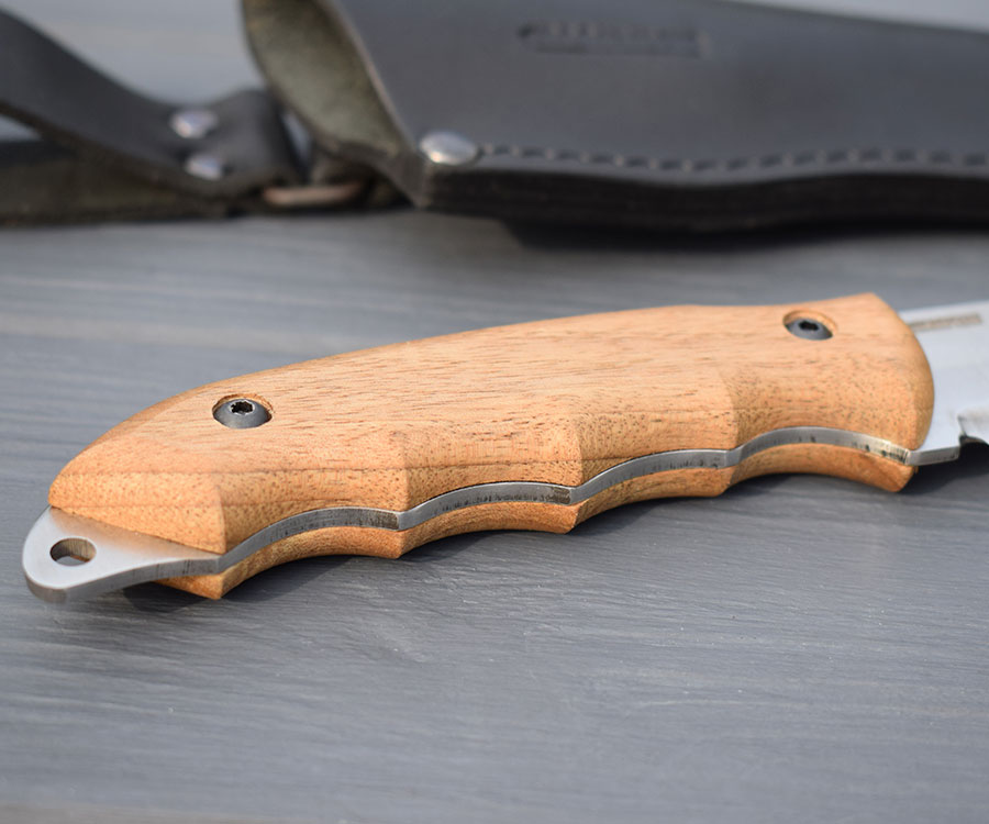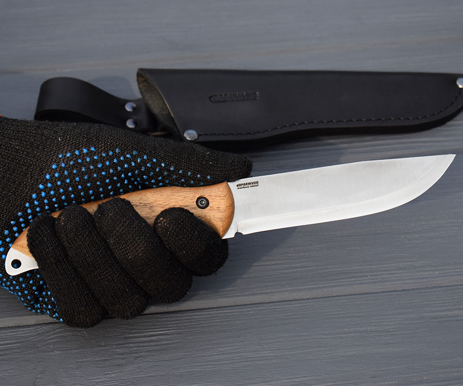 Туристичний ніж BPS Knives HK5S створено для використання на полюванні, риболовлі, у походах, у саду або просто на пікніку. Ніж має класичну форму леза, що робить його універсальним у використанні, а зручна форма рукояті з підпальцевими виїмками дають змогу ножу впевнено та надійно лежати в руці. Туристичний ніж має конструкцію Full Tang, що робить його міцним і надійним помічником на відпочинку та в дикій природі. Лезо виготовлено з вуглецевої сталі 65Г, загартованість – 57-59 HRC. Заточування – Scandi Grind, дає змогу легко працювати з деревиною будь-якої жорсткості та за різних температур. Ручку ножа виготовлено з деревини горіха, вкрито датською олією, що дозволяє йому не боятися вологи та бруду. Фіксація ручки за допомогою стяжок дає змогу легко відкрутити накладки та почистити ніж. Оскільки лезо ножа BPS Knives HK5S Full Tang 65G HRC59 вироблено з вуглецевої сталі, після використання потрібно добре вимити його та витерти насухо, аби запобігти корозії ножа.