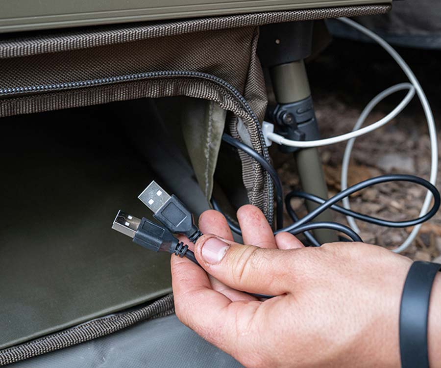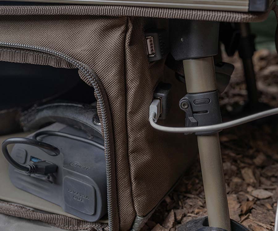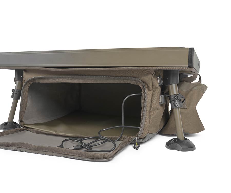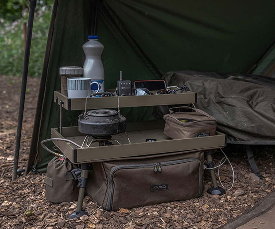 Avid Carp Double Decker Bivvy Organizer має двоярусну стільницю для зберігання і розміщення усіх необхідних риболову речей. У нижніх відділеннях сумки-органайзера розміщують більші снасті. Якщо ви шукаєте повноцінне сховище для снастей і для речей першої необхідності, не шукайте далі. У нижньому відділенні органайзера є 2 порти USB, а це значить, що тепер ви можете зберігати свої Powerbank у нижній сумці, й вони не будуть заважати при підзарядці ваших пристроїв на стільницях. Нижня сумка також ідеально підходить для зберігання великих предметів кухонного обладнання. Double Decker Bivvy Organizer також постачається з мішком для газового балона, який можна прикріпити з будь-якої сторони нижньої сумки. Шарнірний верхній ярус має вздовж заднього краю фіксуючу планку, яку зручно використовувати для утримання планшету або телефону в ідеальному положенні для перегляду відео. Він легко складається для зручності транспортування. Ніжки органайзера також компактно складаються щодо рами столу, що дуже зручно при транспортуванні й зберіганні.