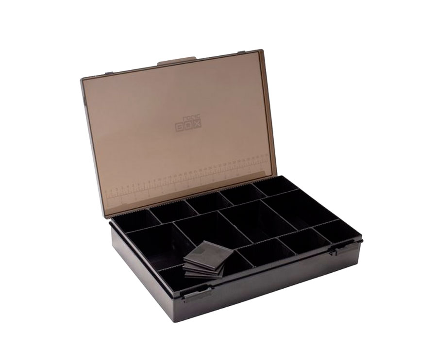 Оновлені коробки для снастей Box Logic — це класична система зберігання дрібнички. Тонована кришка. Ковзаючі передні замки. На кришці лінійка для в'язки повідців. Три основні відділення. Одне відділення повної ширини. В комплект Nash Medium Tackle Box Loaded входить: 6шт маленьких роздільників. 1шт Slim Box 8 — коробка для дрібнички з 8 відділеннями. 1шт Shallow Box 6 — коробка для дрібнички з 6 відділеннями. 1шт Shallow Box 2 — коробка для дрібнички з 2 відділеннями. 4шт Linkers Box — маленькі коробочки для гачків, колечок, вертлюгів і т.д.