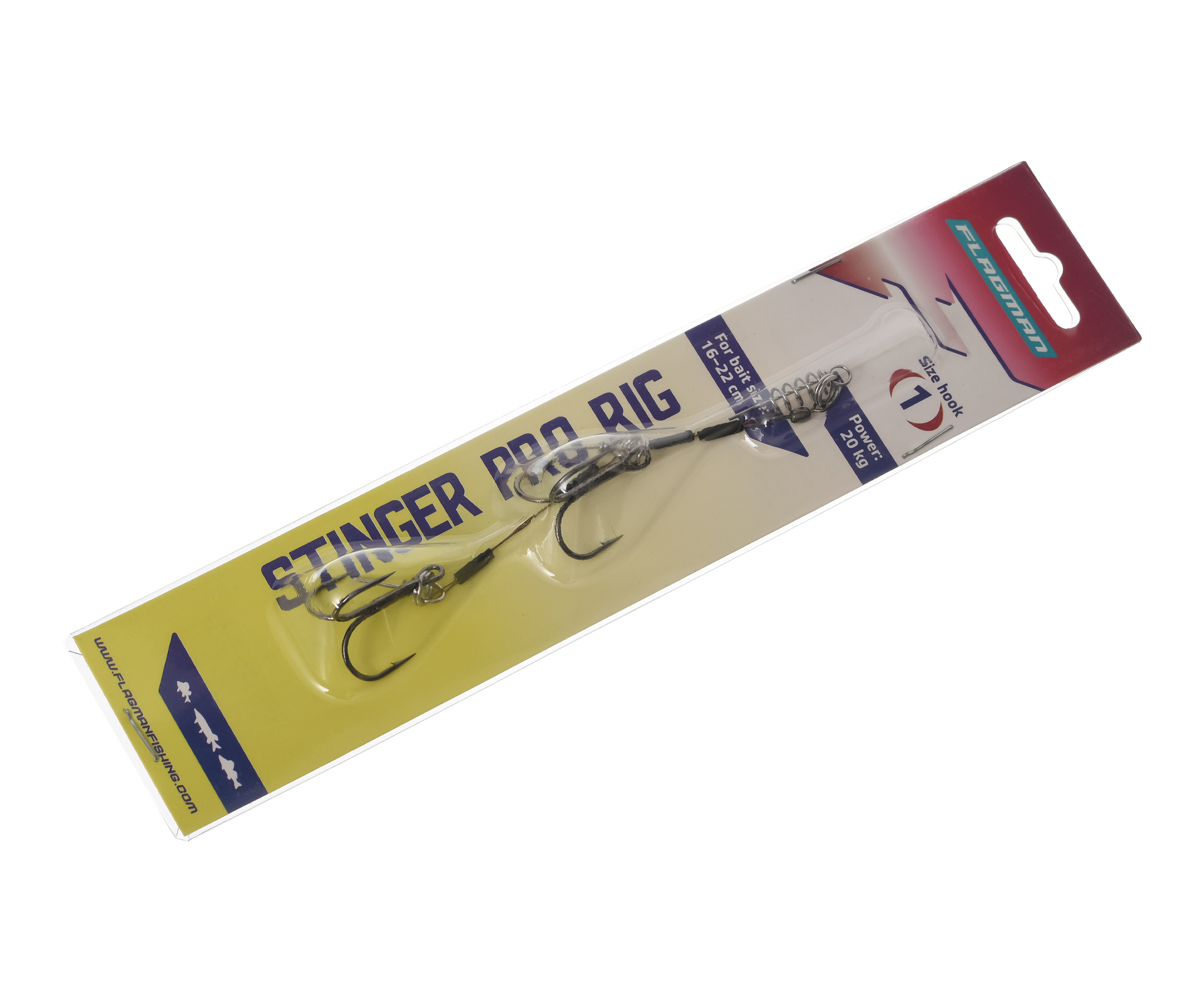 Оснастка Flagman Stinger Pro Rig 2-hook – повністю готовий для використання монтаж для великих силіконових приманок. Його виготовлено з якісного нержавіючого дроту та багатожильного повідцевого матеріалу. Монтаж складається з джиг-спіралі, завідних кілець підвищеної міцності, 2 фіксаторів і 2 якісних трійників. Такі оснастки не порушують гру приманок, дають змогу подовжити термін їхньої служби, а також сприяють максимальній реалізації клювань трофейної риби. Оснастки для великих приманок Flagman Stinger Pro Rig випускають у розмірах M, L, XL.