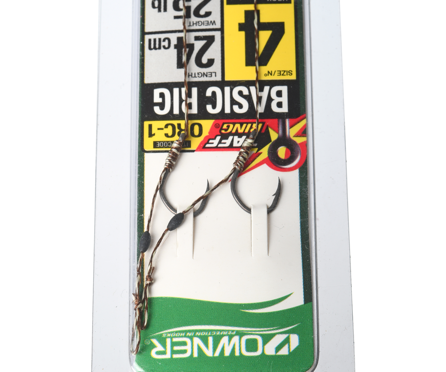 Owner ORC-1 Basic Rig – універсальна серія коропових повідців, що належать до так званих «волосяних» оснасток. Повідці цієї серії підходять для найрізноманітніших умов ловлі. На їхню універсальність і «базовість» указує й сама назва серії – Basic Rig. Один кінець м'якого плетеного повідцевого матеріалу прив'язано до високоміцного гачка Owner 53275 CT-5 Carp Taff із суцільним кілечком taff ring, другий – до вертлюжка. На волосі розміщено стопор для запобігання сповзання насадки до гачка. Волос досить довгий, що дозволяє використовувати у ролі насадки як ланцюжок зернин кукурудзи, так і комбінацію бойлів, що мають різні запахи й відрізняються ступенем плавучості. Довжина повідця – 24 см, що теж, певною мірою, базове значення.