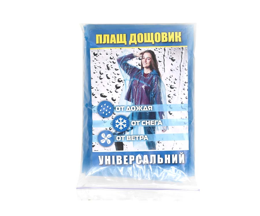 Плащ-пончо універсальний з рукавами – це легкий та компактний у складеному стані плащ, який захистить від вітру, снігу, зливи риболовів, мисливців, грибників, дачників та туристів. Дощовик виготовлено зі щільного поліетилену. Колір – синій. Завдяки великому розміру плащ-дощовик не сковує рухів, дозволяє без проблем використовувати його навіть у зимовий час поверх об'ємного одягу.