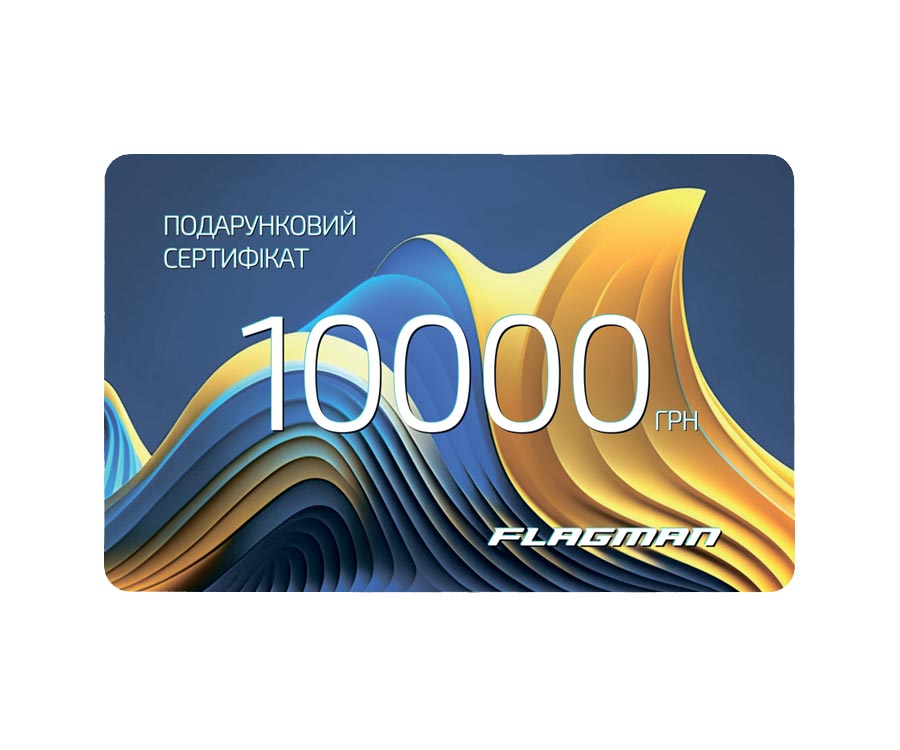 Подарунковий сертифікат номіналом 10 000 грн. дає можливість здійснити одноразову покупку в будь-якому магазині мережі Flagman на суму 10 000 грн. Подарунковий сертифікат – найкращий подарунок для будь-якого риболова!