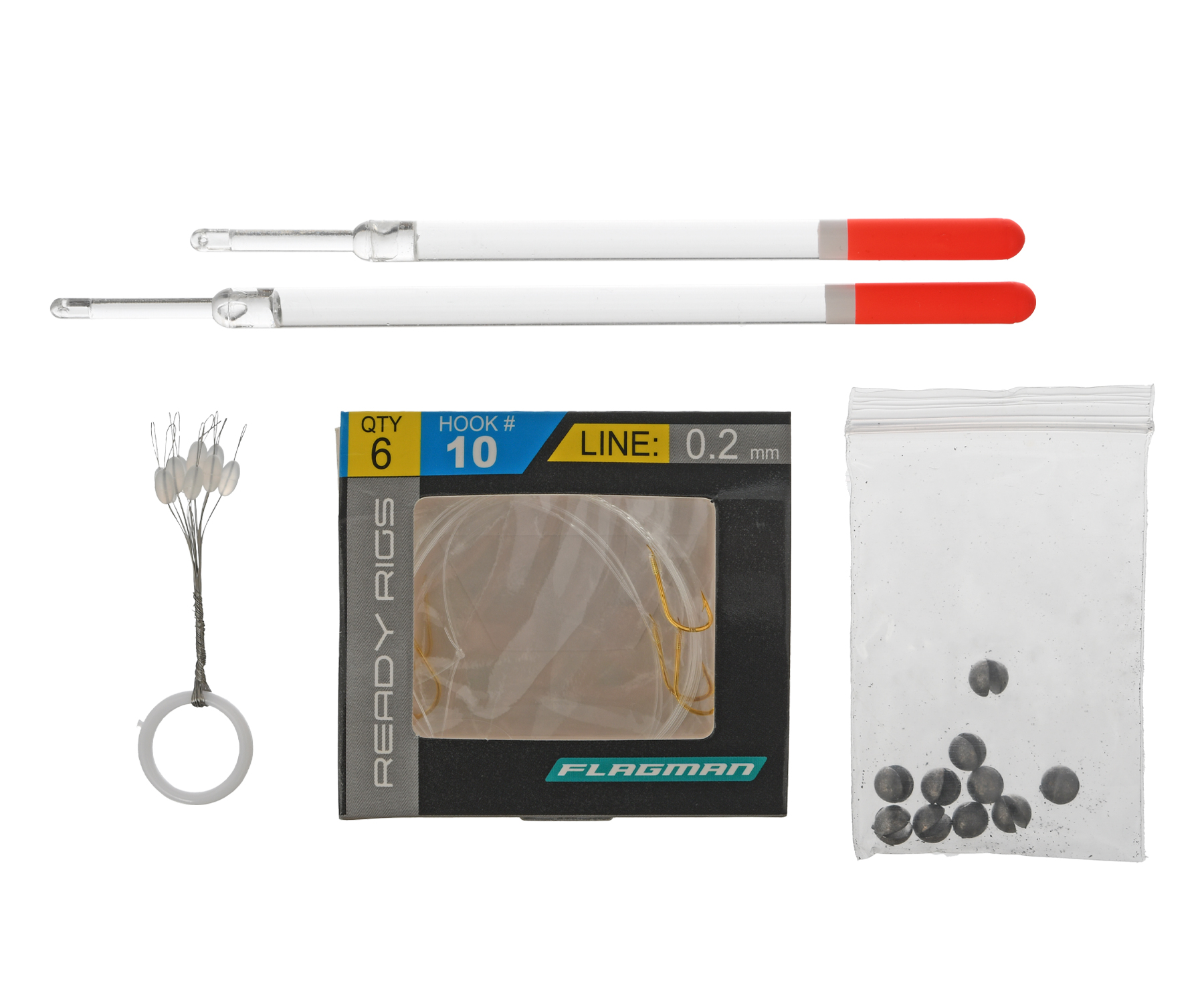 Flagman Pole Tackle Set – зручний набір для поплавцевої риболовлі. У комплекті: 2 поплавця з обваженням 0,8 та 1,2 г, 10 тягарців-шротинок вагою по 0,4 г, набір із 10 стопорів та 6 готових повідців із жилки 0,2 мм із гачком №10. Оптимально підібрані аксесуари дають змогу швидко та без ускладнень самостійно зібрати ефективну оснастку для поплавцевої вудки.