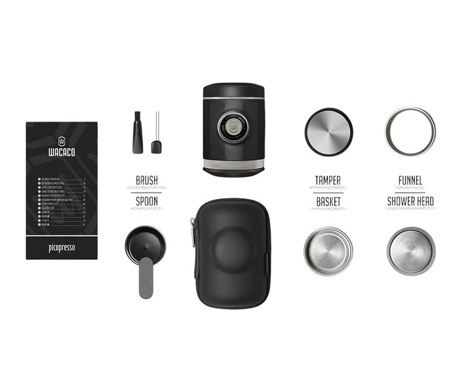 Кавоварка Wacaco Picopresso, подвійний фільтр, інструмент для розподілу кави, темпер, мірна лопатка, проставочне кільце, щіточка для чищення, мішечок для зберігання, інструкція користувача та талон гарантії.