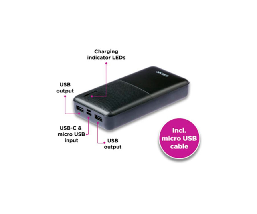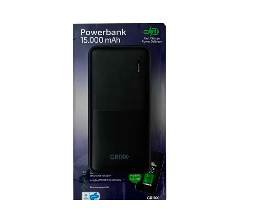 Grixx Powerbank 15000 мАг Fast Charge обладнано двома портами USB-A і портом USB-C PD для одночасного заряджання двох пристроїв. Швидка зарядка: 50% за 30 хвилин. Зарядити повербанк можна через порти USB-C або Micro-USB. Кабель Micro-USB входить до комплекту. У Grixx Powerbank встановлено літій-полімерні акумулятори. Передбачено: індикатор заряду батареї, захист від перенапруги, перевантаження, короткого замикання тощо. Повністю зарядженим Grixx Powerbank 15000 мАг можна заряджати мобільні гаджети декілька разів залежно від ємності їхнього акумулятора.