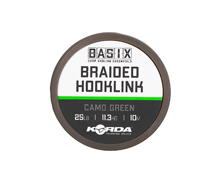 Korda Basix Braided Hooklink – дуже м'який, але водночас міцний і стійкий до стирання матеріал, який ідеально підійде для виготовлення коропових монтажів. Камуфляжно-зелений колір Korda Basix Braided Hooklink добре поєднується з будь-яким дном озера, на якому ви рибалите. Постачається з розривним навантаженням 18 та 25 фунтів у розмотуванні 10 м.