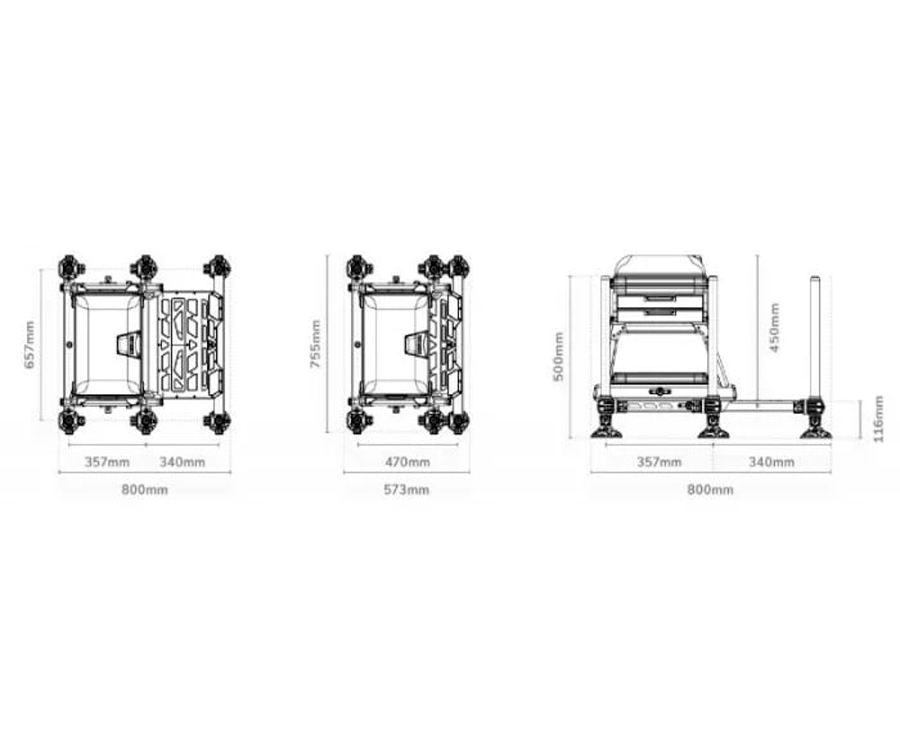 Під м'яким сидінням розташовані два висувних лотки, призначені для зберігання снастей та інструментів. Додатково передбачено шухляду з кришкою в нижній частині платформи. За необхідності можна встановити додаткові ящики, адаптуючи функціональність платформи під індивідуальні потреби рибалки.