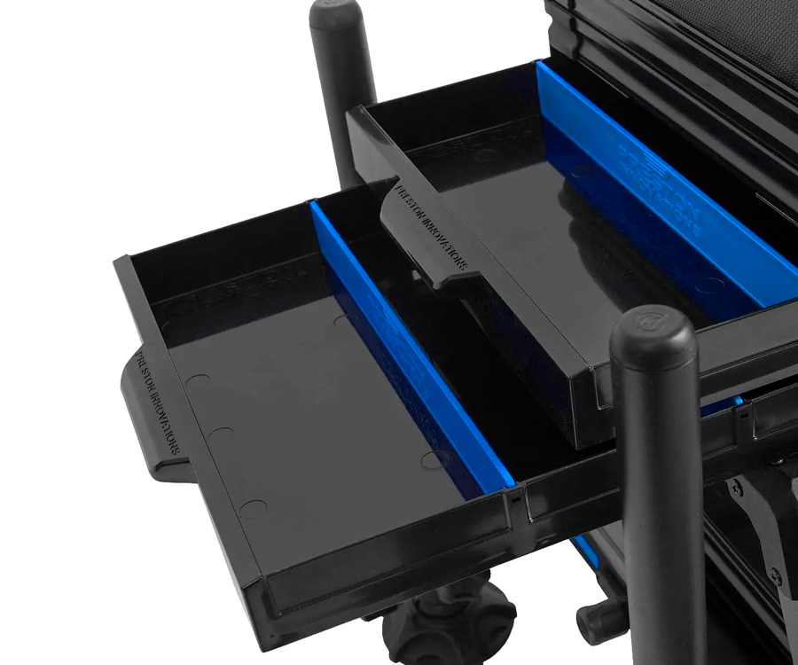 Під м'яким сидінням розташовані два висувних лотки, призначені для зберігання снастей та інструментів. Додатково передбачено шухляду з кришкою в нижній частині платформи. За необхідності можна встановити додаткові ящики, адаптуючи функціональність платформи під індивідуальні потреби рибалки.